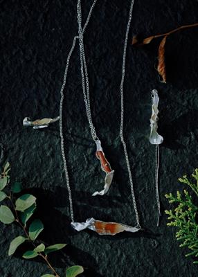 简介:“夜来风叶已鸣廊,看取眉头鬓上。”叶,是不会飞翔的小鸟。叶片做为生活中最常见的事物,往往被人们所忽略,但是宋代的文人们往往借叶子抒发自己的情感。这一套首饰整体呈现一片叶子的形态,中间夹杂不同种类和形状的石头,表达每一片叶子都能带来新的希望,就好像鸟儿把自由带给人们,叶子经过四季变化把对根的情意报答给土壤。