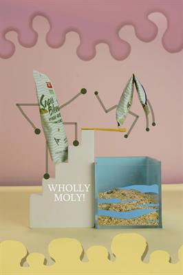 作品阐述:本产品是好哩品牌下的一款代餐谷物饮品,名为萄气南瓜籽。在拍摄上选择了拟人化的手法,将产品设置在海滩、城市、跳台、草地四个场景,并结合每个场景设置人物情节,通过置景和后期手绘的方式去实现动态感和拟人化,从而达到提升趣味性的效果,符合品牌年轻受众群体的目标。