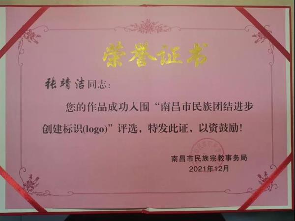2021年9月,南昌市民宗局面向社会公开征集南昌市民族团结进步创建标识(logo),参赛作品共计172件。南昌市民宗局邀请了省内著名专家学者,对所有入围作品进行评审,最终按照方案征集要求,确定采用作品1件、入围作品9件,20级广告艺术设计班张靖洁同学的2件作品在此次征集中荣获入围奖(二等奖)。