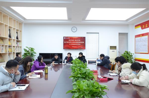 王筱芽对党建思政工作进行补充部署,她强调要“五坚持五促进”,坚持统筹安排促进学习教育,实现政策党史学习成果有效转化;坚持率先垂范促进自身发展,以教风促学风,树立系统观念推进教学发展;坚持立德树人促进师德师风,敬畏岗位职责,牢记底线思维;坚持全员育人促进课程思政,以课程思政推进立德树人根本任务;坚持参与齐抓促进党建思政,统一思想凝聚共识推进发展。