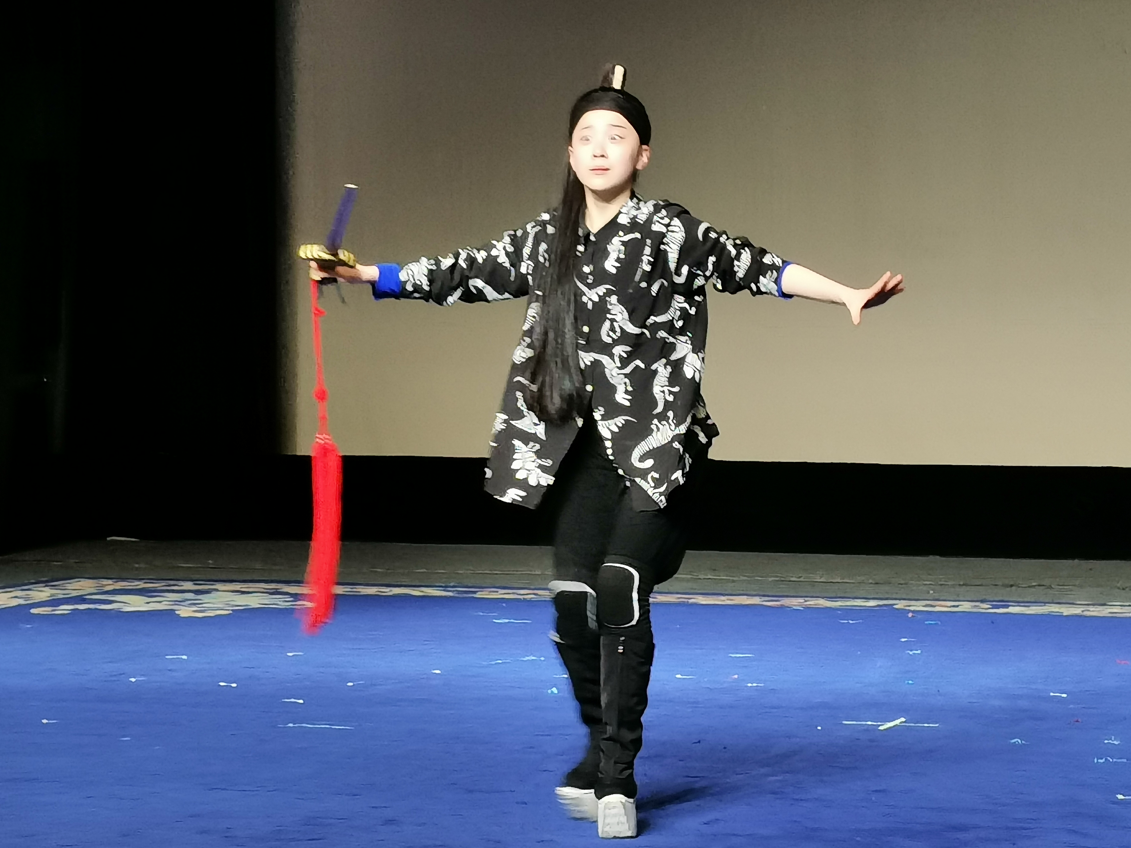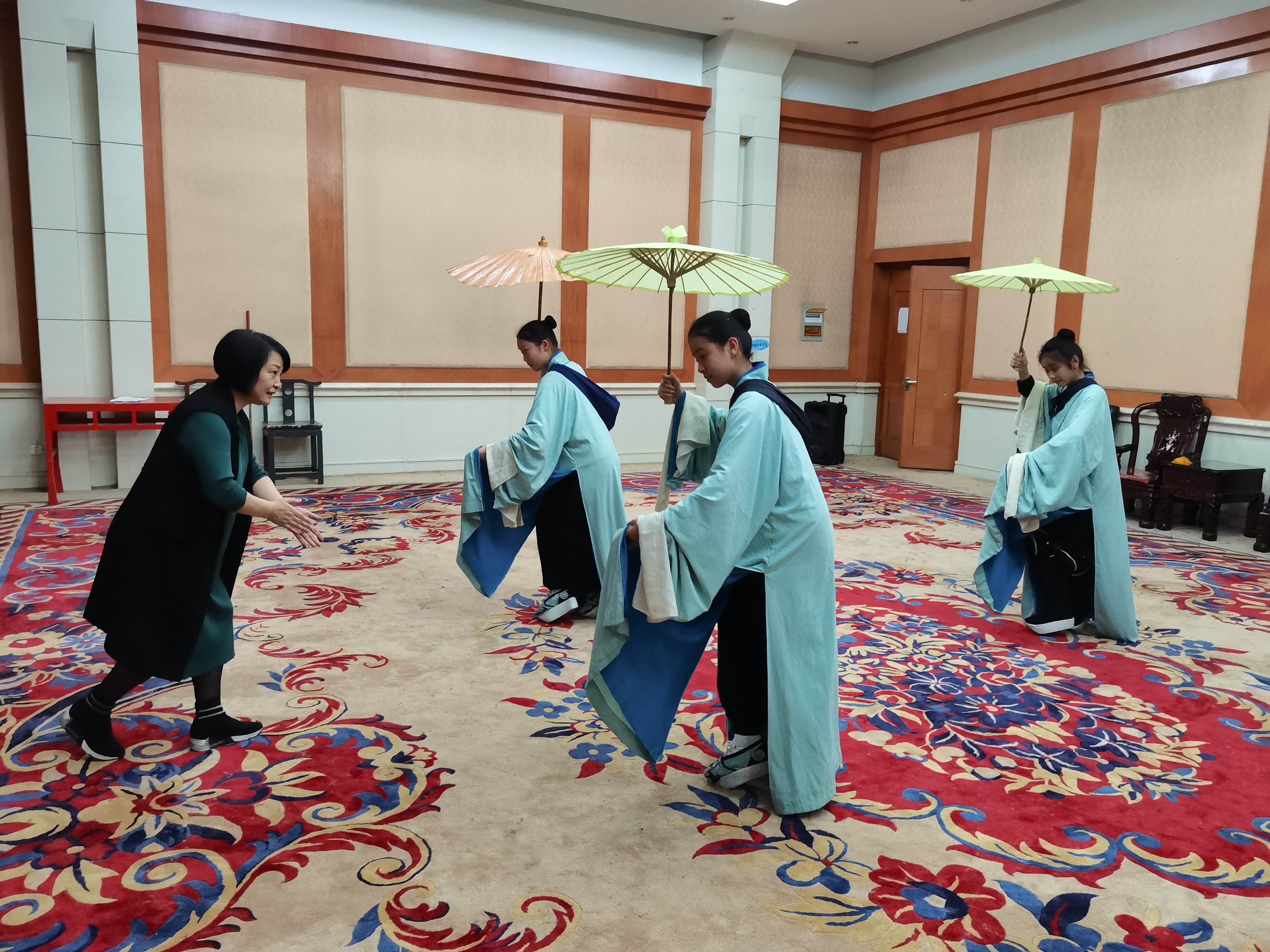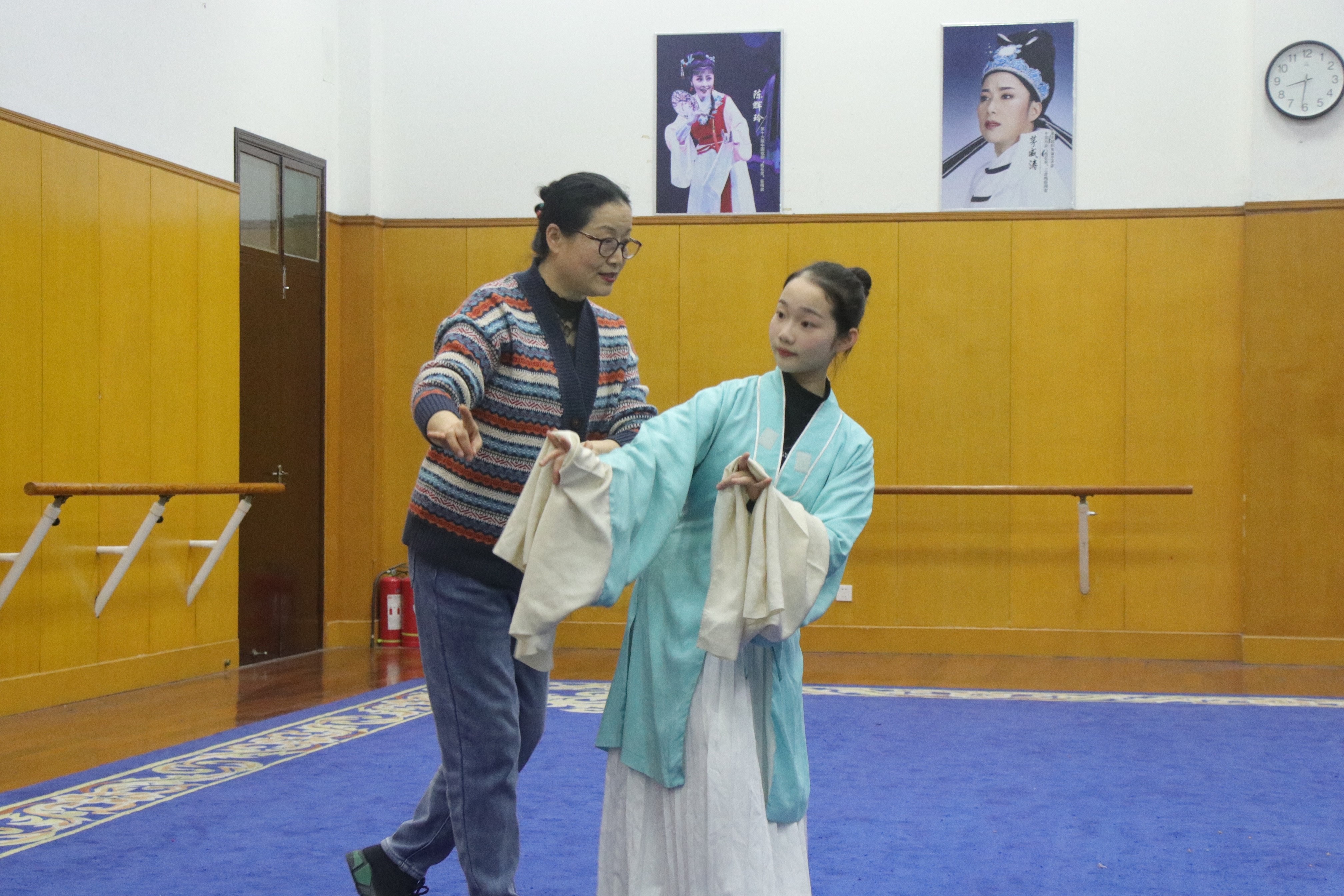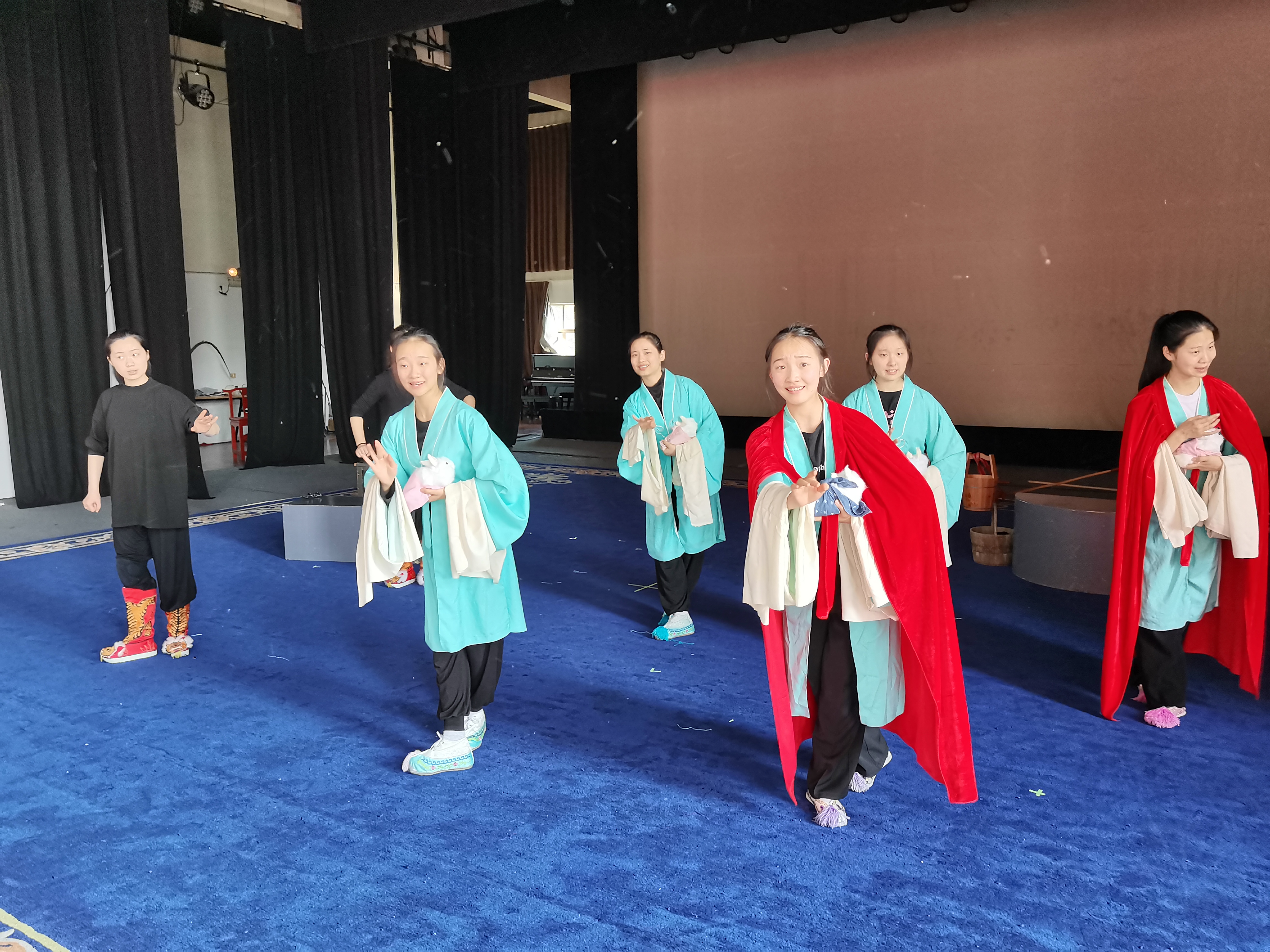 在周末的小剧场里,几缕阳光透过窗户挤进来,参赛的同学正在专心练习着自己的比赛内容,老师们牺牲自己的周末时光,对学生们一一指导纠正:一举步、一回眸、一板一眼,雕刻入微。如此这般,同学们常常一练就是一整天,练得满头大汗,甚至膝盖红肿都已经成了家常便饭。为了做一个优秀的戏曲人,在全国和全省舞台上展现所学,她们顶住巨大压力,不折不挠,潜心修炼。湿透的衣服、练坏的道具、磨损的练功鞋都是她们坚毅品格的最好体现。