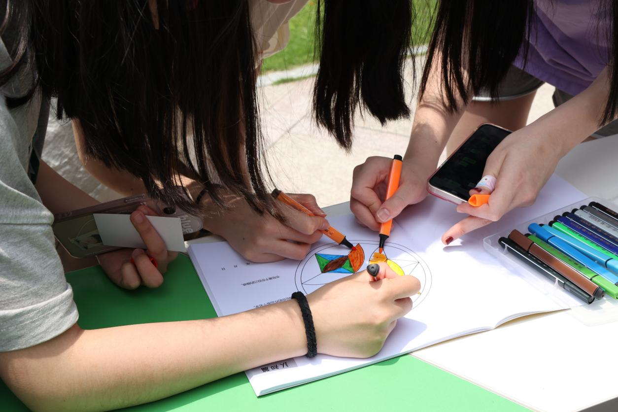 8号楼正前方,国旗下矗立着此次心动嘉年华的活动指南牌。活动围绕八个子活动推进同学们之间的合作关系,也有利于锻炼各自的应变能力。同学们在起点处拿到用于记录的卡片后开始计时,参与八个主题游戏并收集志愿者的小红章,返回起点结束计时即完成任务。“珠行万里”“无敌风火轮”“合力建塔”等合作性活动考验团队配合度,吸引了一大批热情的体验者。“潜意识的力量”“答案之书”“解压涂色板”等治愈系活动也纾解了同学们的心头之忧。