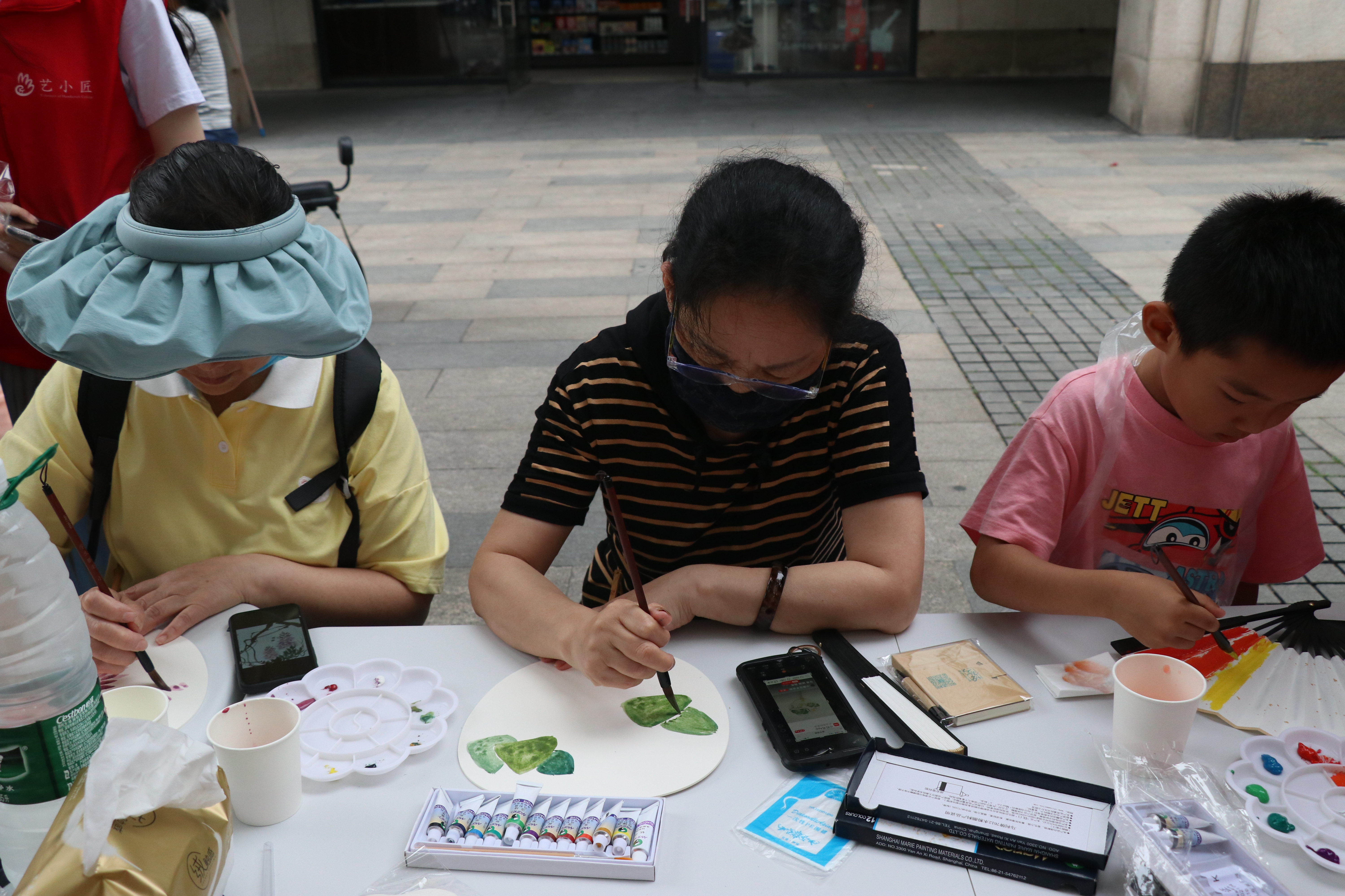 艺小匠们给现场体验者分发绘画工具和扇子,鼓励大家进行自由作画。在长方桌上,男女老少体验者对着空白的扇子聚精会神地描绘,有的画花卉,有的画粽子,有的写祝福,将一幅幅充满端午气氛的画作呈现在一把小小的扇子上。家住社区的耿老师笔法行如流水,扇面作品栩栩如生,一口气创作了四五把精美别致的扇面画。