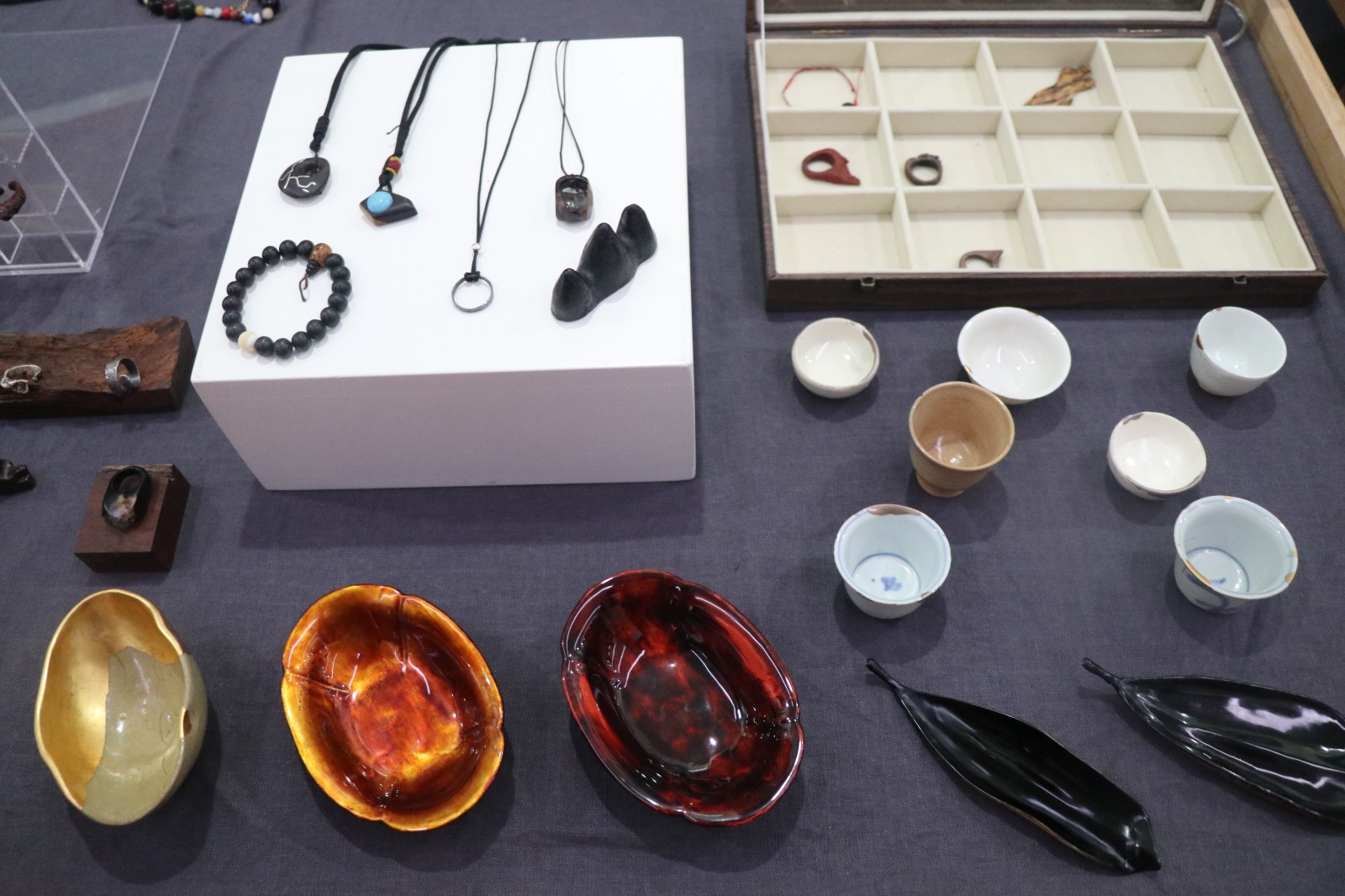 “传统书画装裱古籍修复”的摊位上,同学们可以了解到不同种类的古籍装帧类型,并体验线装本活动,深入感受文物修复的魅力。“金缮与器皿”摊位琳琅满目,以火枪加热银条而铸造的银戒,打磨檀木后镶嵌上琉璃的项链,上大漆推光后制成的落叶器皿,文物修复与保护专业的同学们让非遗传统技艺在文创产品中焕发出新的生机。