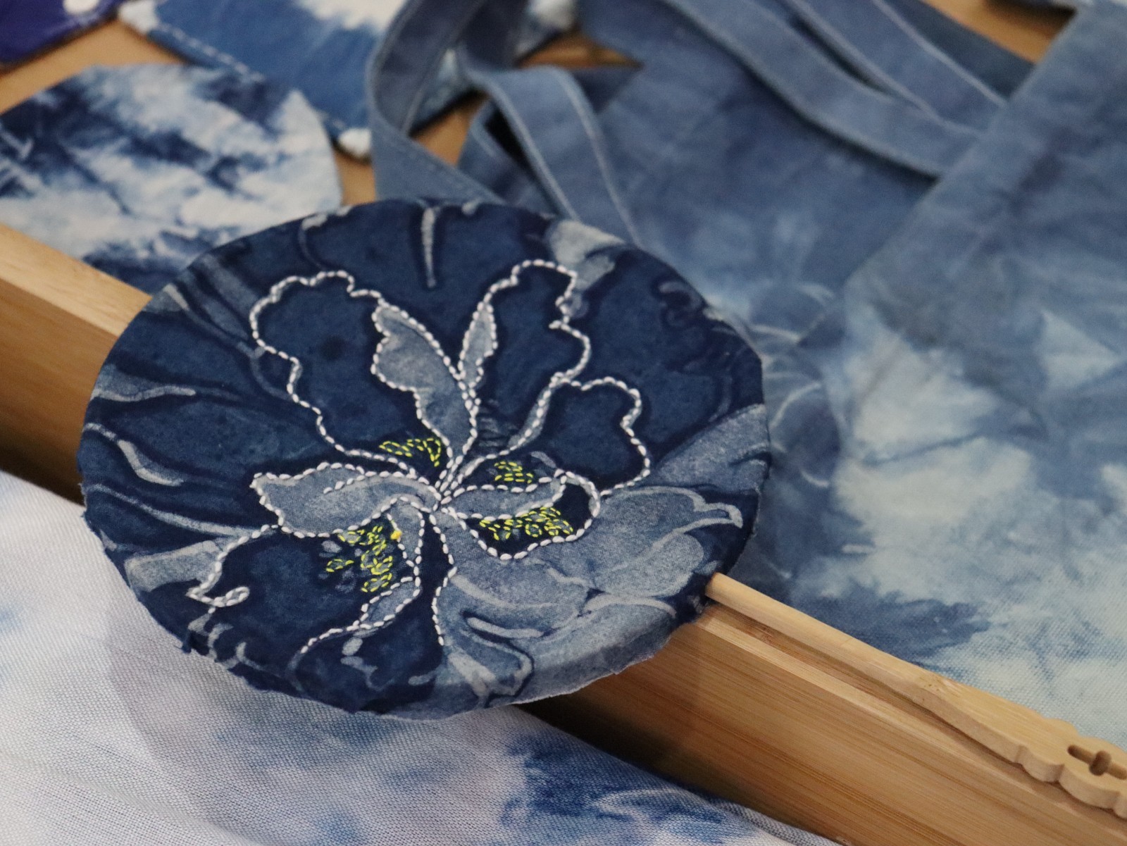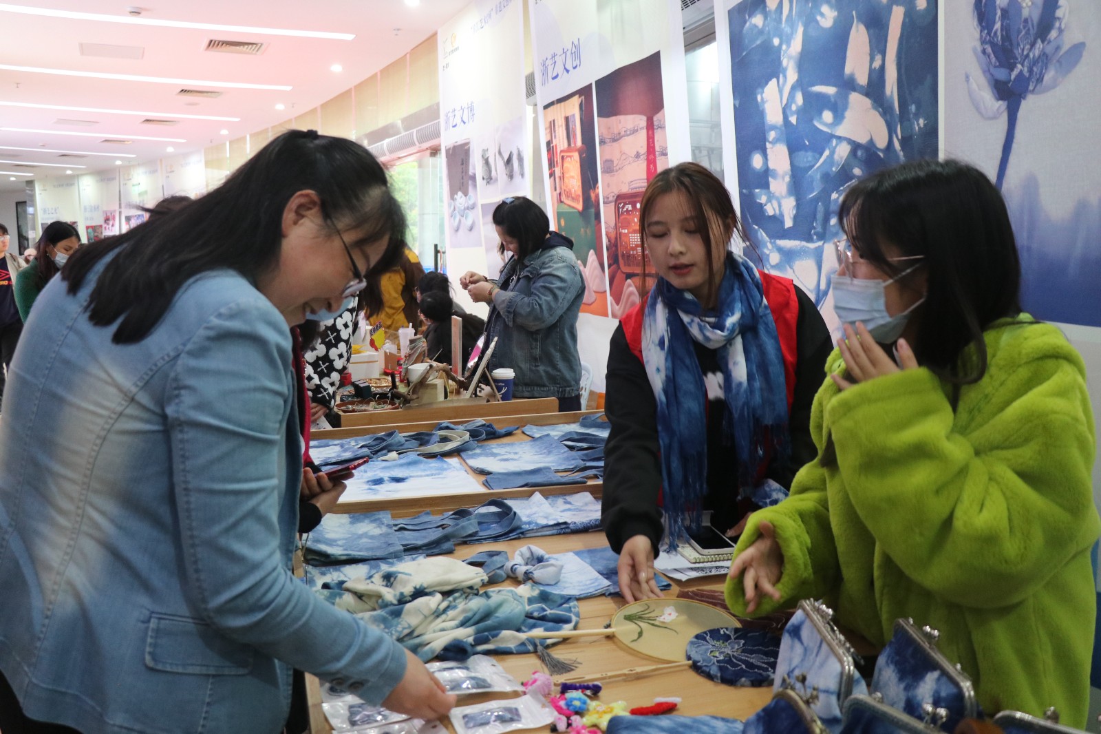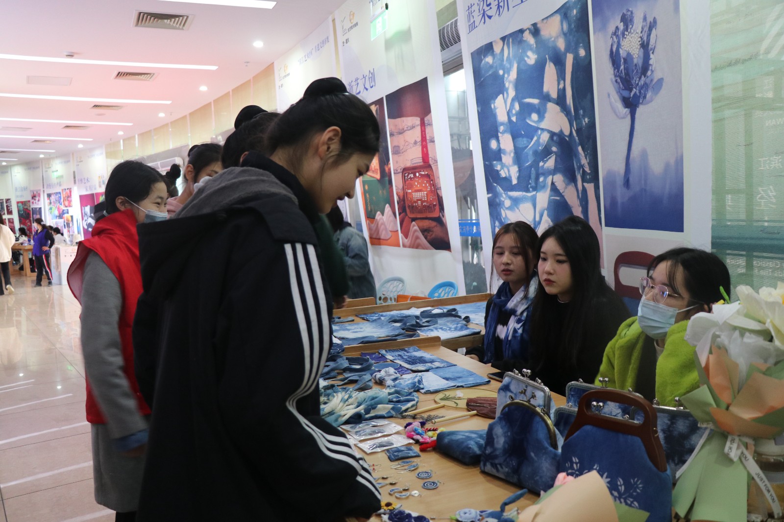 来到“蓝染新生”和“青瓷镌刻”摊位,大家在蓝色海洋中又感受到了不同的非遗文化。民族传统技艺专业的同学们以扎染的手法制作出的包包和雅致的耳环与方巾,用专业的技术传承与延续青瓷文化,一件件器物散发独具匠心的美感。