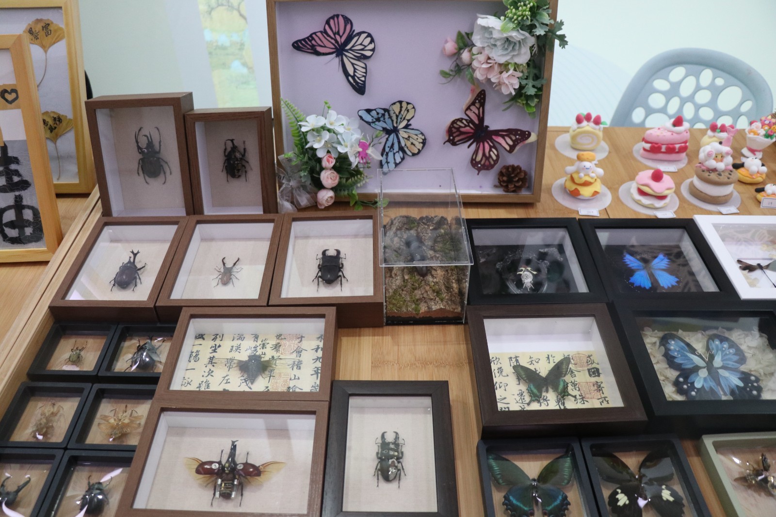 “博物衍生”的摊位上,也有令人眼前一亮的惊喜文创。展示艺术设计专业的同学们将自然与文创产品结合,制作的蝴蝶标本小巧且精致,在感受自然的同时也让人感慨其独特技艺。