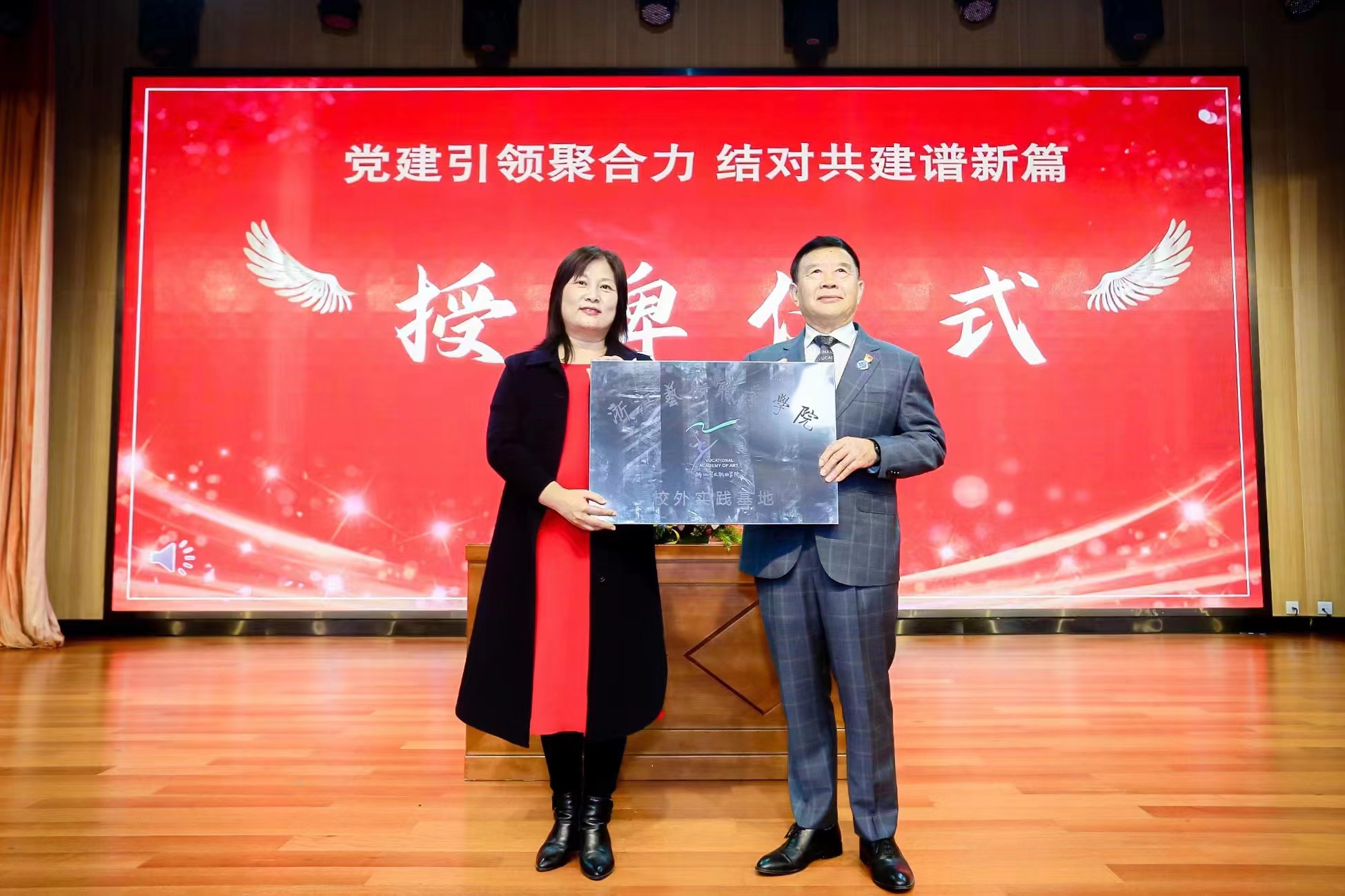 为深入学习宣传贯彻党的二十大精神,弘扬优秀传统文化,发挥党建引领作用,共同构建“基础知识、核心素养、专项特长”三位一体教学模式,完善大中小学相衔接的美育课程体系,11月27日晚,戏曲学院党总支赴杭州锦绣育才教育集团公办育才大城北中学,开展党建结对共建活动。戏曲学院党总支书记、副院长谢青,副院长周伟君,专职副书记谢志勇,杭州锦绣育才教育集团书记郁龙旺出席签约仪式,双方党员教师共同参加。谢青与郁龙旺共同签订了协议书,周伟君为校外实践基地揭牌。