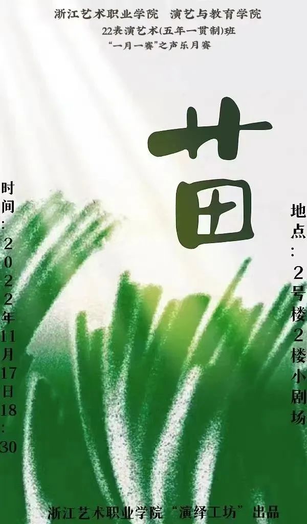青春正在进行,我们风华正茂。近日,演教学院2022级表演艺术(五年一贯制)班在二号楼小剧场举行首次声乐月赛《苗》。