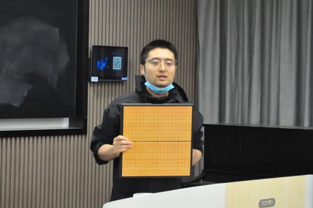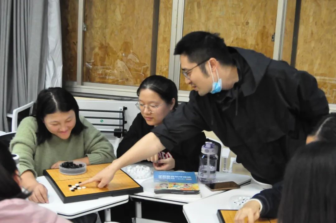 为了让大家在实践中更好地掌握理论知识,方栋在棋盘上摆出“扭十字”的布局,让同学们现场实践。虽然在座的很多同学都是第一次接触围棋,但是在王超骏和方栋两位老师的共同指导下,同学们两两相对而坐,在棋盘上排兵布阵、斗智斗勇。