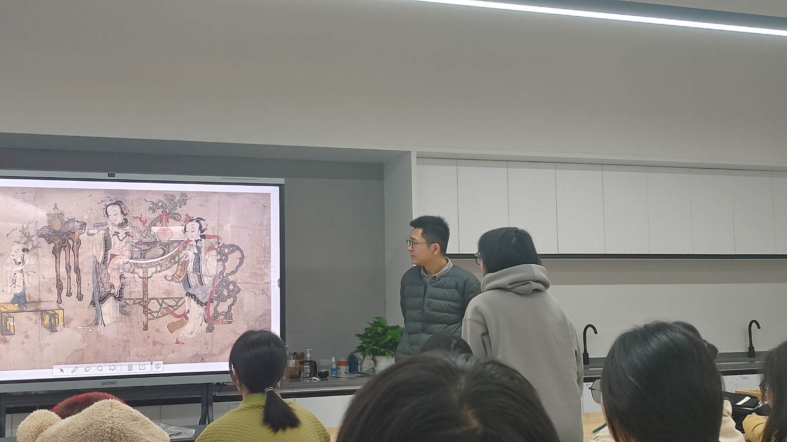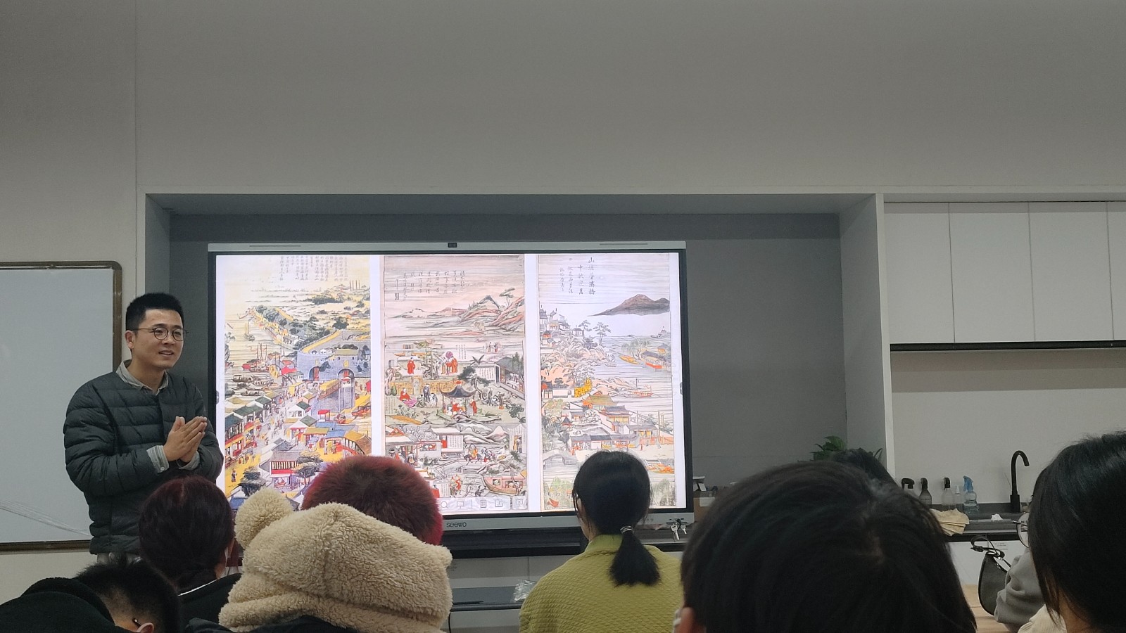 讲座伊始,高迅以“年”字组词为插入点,讨论了各项新年活动,营造了红火的新年氛围,并从国家广电总局主办的电视剧《山海情》中的年画展开介绍。年画,是中国特有的民间美术形式。旧时人们盛行在室内贴年画,户上贴门神,以祝愿新年吉庆,驱凶迎祥。