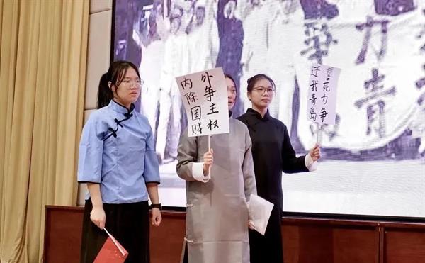 21学前1班的五位同学呈现的情景剧《觉醒吧青年》,以巴黎和会上中国外交的失败后中国青年学生思想觉醒为背景,通过从课堂到上街游行抗议的情景变换,让同学们亲临历史现场,激发他们心底的责任感和使命感,从而担当起民族大任成为中华民族谋复兴的力量。