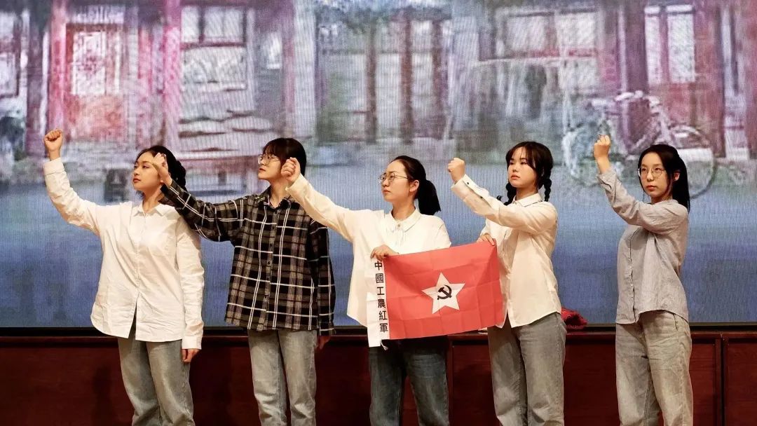 22定向1班的五位同学的《党旗在心中》情景剧讲述的是五个普通党员与党组织失去联系,她们以“永不叛党”的入党誓言和“党旗在人就在”的信念不断激励自己,彼此相互扶持一路相伴,最终与党组织取得联系。她们用实际行动展现了共产党人对党永远不变的忠心和赤诚。