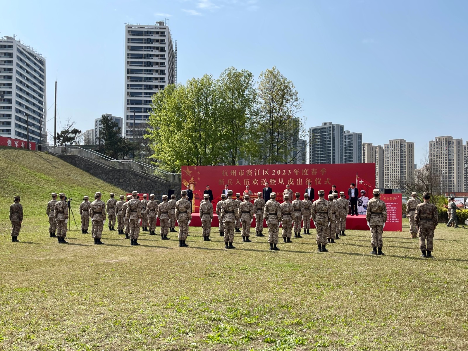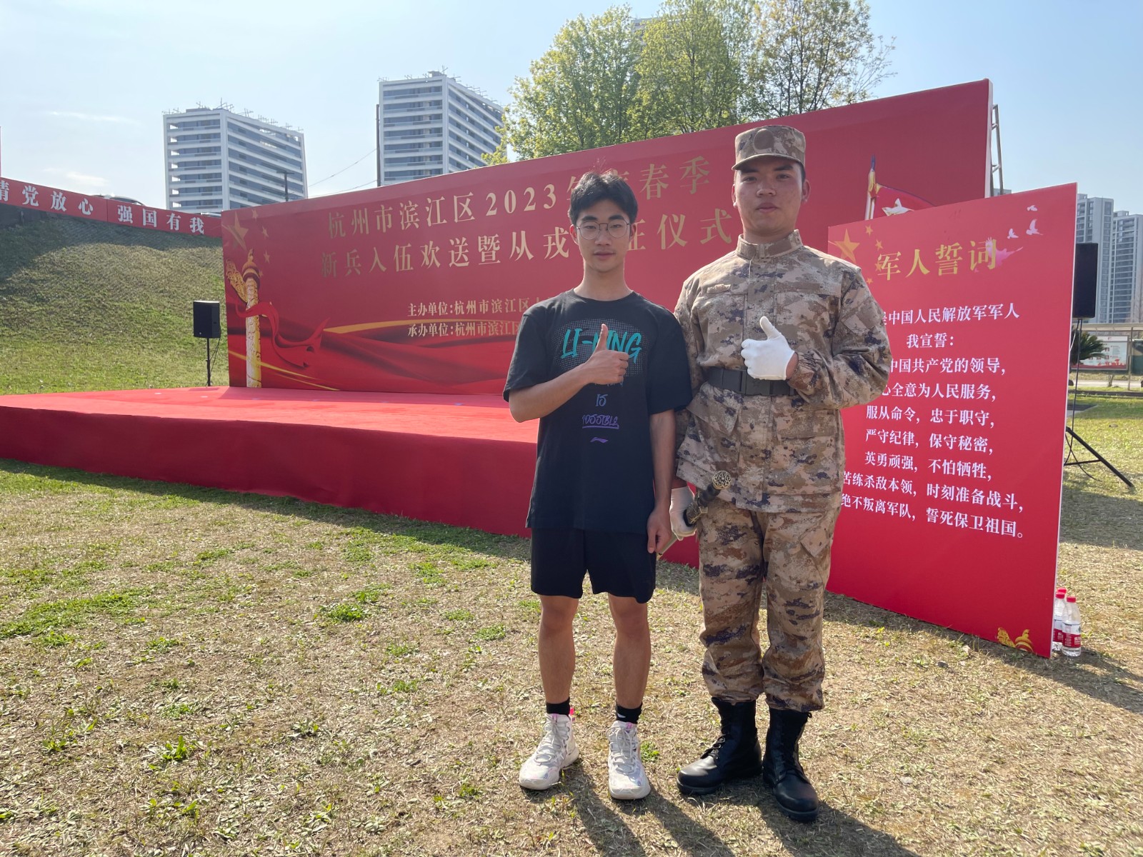 携笔从戎家国梦,淬炼成钢军旅情。3月15日,杭州市滨江区2023年度春季新兵入伍欢送暨从戎出征仪式在浦沿街道举行,手工艺学院22展示班杨之圣经过体检、政审、役前训练、定兵等层层考核,最终光荣入伍。手工艺学院党总支专职副书记王筱芽,辅导员胡墨智丽,学生代表陈斯涵和杨之圣的家人到场参加欢送会。