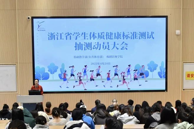 为迎接浙江省大学生体质健康标准测试抽测,4月24日中午,戏剧影视学院在阶梯二教室召开体测抽测动员大会。
