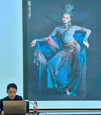 崔晓东介绍了他从事戏剧影视服装设计行业多年来的宝贵心得。在案例分析环节,他向大家分享了舞台剧《平潭映象》,舞剧《诺玛阿美》《尘埃落定》等设计作品,分享了大量的设计手稿、幕后创作过程以及最后作品呈现出来的舞台效果。同时,他结合作品创作历程,讲解了面料再造的具体过程和使用方式,强调了从事戏剧服装行业应该掌握的必备专业基础课程及其重要性,鼓励大家多看、多学、多练。