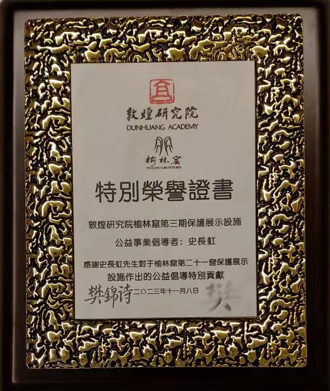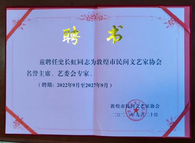 2022年9月,史长虹受聘为敦煌市民间文艺家协会名誉主席和艺委会专家。2023年11月7日,敦煌市常务副市长何生粼和敦煌市民间文艺家协会主席李德峰共同颁发了这份迟到的聘书。次日,史长虹应邀参加敦煌研究院榆林窟第三期保护性展示设施评审验收会议。敦煌研究院名誉院长樊锦诗,党委书记赵声良,党委委员、纪委书记王建党等出席评审验收会。史长虹作为公益事业倡导者的代表参加会议,并接受敦煌研究院樊锦诗老院长和现任党委书记赵声良颁发的特别荣誉证书。