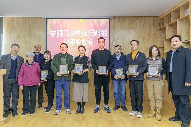 樊锦诗(左二)、赵声良(左一)、杨天荣(右一,榆林窟所长)、李立新(左三,榆林窟副所长)等和大家合影。