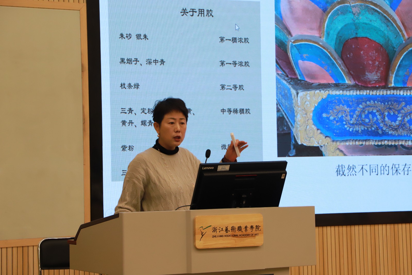 为了解古建筑壁画彩塑的保护与修复,拓宽对文物保护的视野和认知,12月4日上午,手工艺学院开展了“求真守艺”大讲堂第33讲专题讲座活动,特邀中国文化遗产研究院研究馆员,文博教育科技培训学院教务长,全国文物保护行业职业教育教学指导委员会副秘书长张晓彤带来一场题为《古建筑壁画彩塑保护修复前期研究教学与实践》的专题讲座,讲座由文物修复与保护教研室主任潘文娟主持。