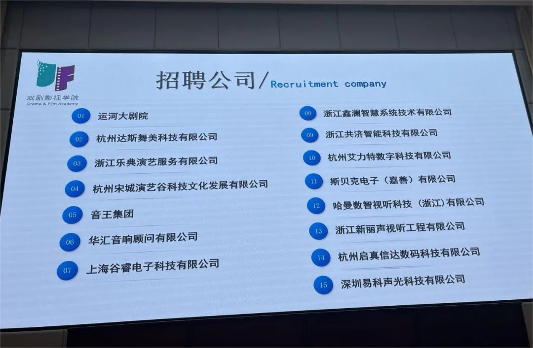促进2024届毕业生就业,提升学生的就业意识和就业能力,实现平台共享、资源共聚,12月6日下午,戏剧影视学院音像技术专业专场招聘会在图信报告厅举办。本次招聘会由音像技术专业带头人、青年教师科研团队——音像技术专业技术技能研究创新团队负责人王芳组织开展,共有浙江演艺集团剧院经营管理有限公司、杭州宋城演艺谷科技文化发展有限公司、华汇音响顾问有限公司、音王集团、杭州达斯舞美科技有限公司等15家企业参与招聘。招聘会由学院学工主管颉顺虎主持。