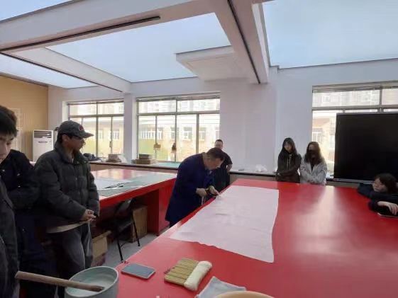 《书画修复》课程,江杰对托裱进行了演示,详细讲解了全流程,并与同学们在课堂上进行了积极的互动与交流,同时老师们也表示将在后续课程中推进课程教材、数字资源的开发建设与课堂使用。