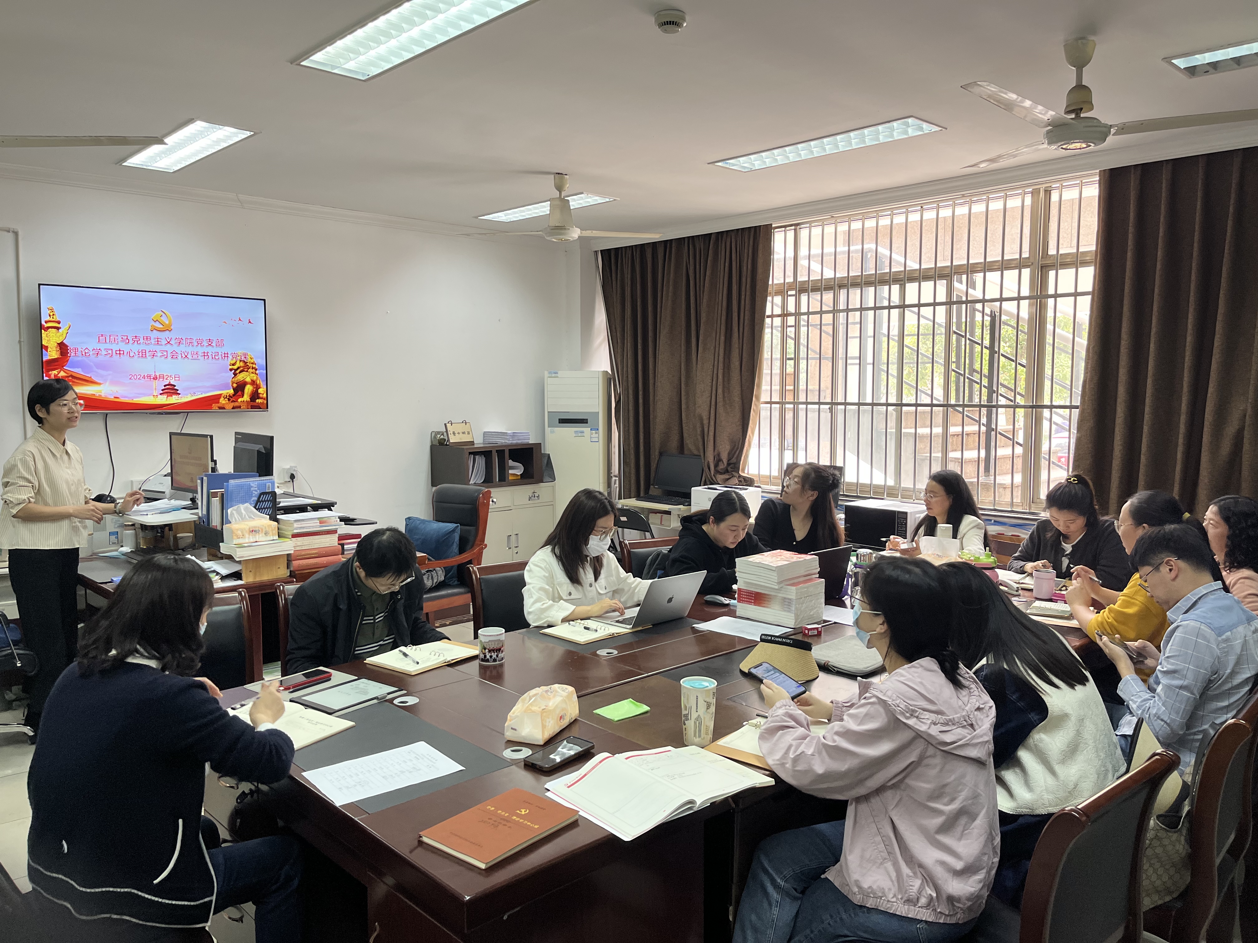 3月25日中午,马克思主义学院直属党支部召开理论学习中心组扩大学习会暨书记讲党课,学习全国“两会”精神。支部全体党员参加学习,会议由支部书记、院长王筱芽主持。