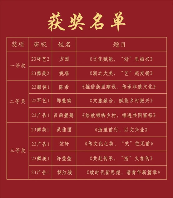 经过前期初赛选拔,共有9名学生入围比赛。参赛选手们紧扣“习近平文化思想在浙江的生动实践”主题,从小处着眼、细处入手,结合身边相关故事、案例和实践活动,充分展现了设计学子独有的蓬勃朝气以及追寻理想的拼搏干劲。经过现场的激烈角逐,汪琳宣布比赛结果。方园、姚瑶获一等奖,陈希、郑萱窈、吕函萱懿获二等奖,吴佳丽、竺轩、许莹莹、胡红骏获三等奖。