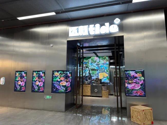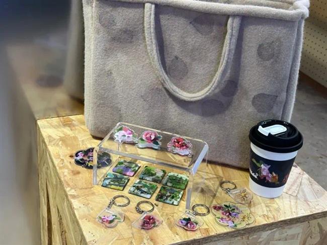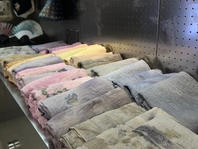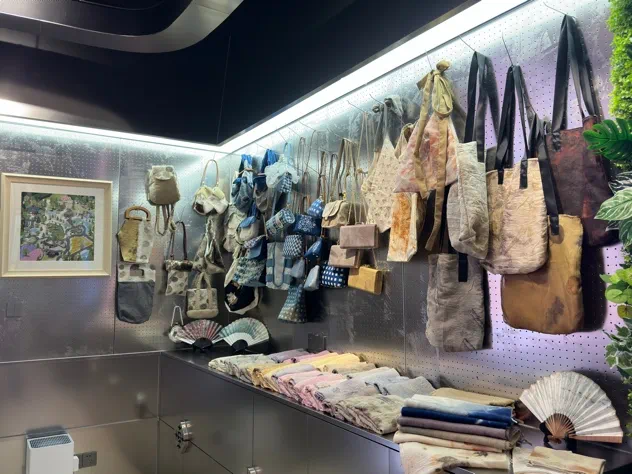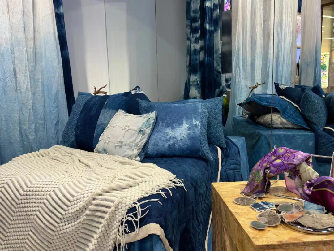 此次主题展览展出手工艺学院民族传统技艺传统印染方向学生定制的一系列创新印染产品,植物染丝巾、手工包、饰品纷纷亮相,创新的设计和精巧的手工得到了现场观众的认可,大受欢迎,进一步提供了学生创新创业的新途径。此外,展览还结合了数智化的展陈方式,通过巧妙融合科技元素,丰富了产品的色彩质感和表达方式。