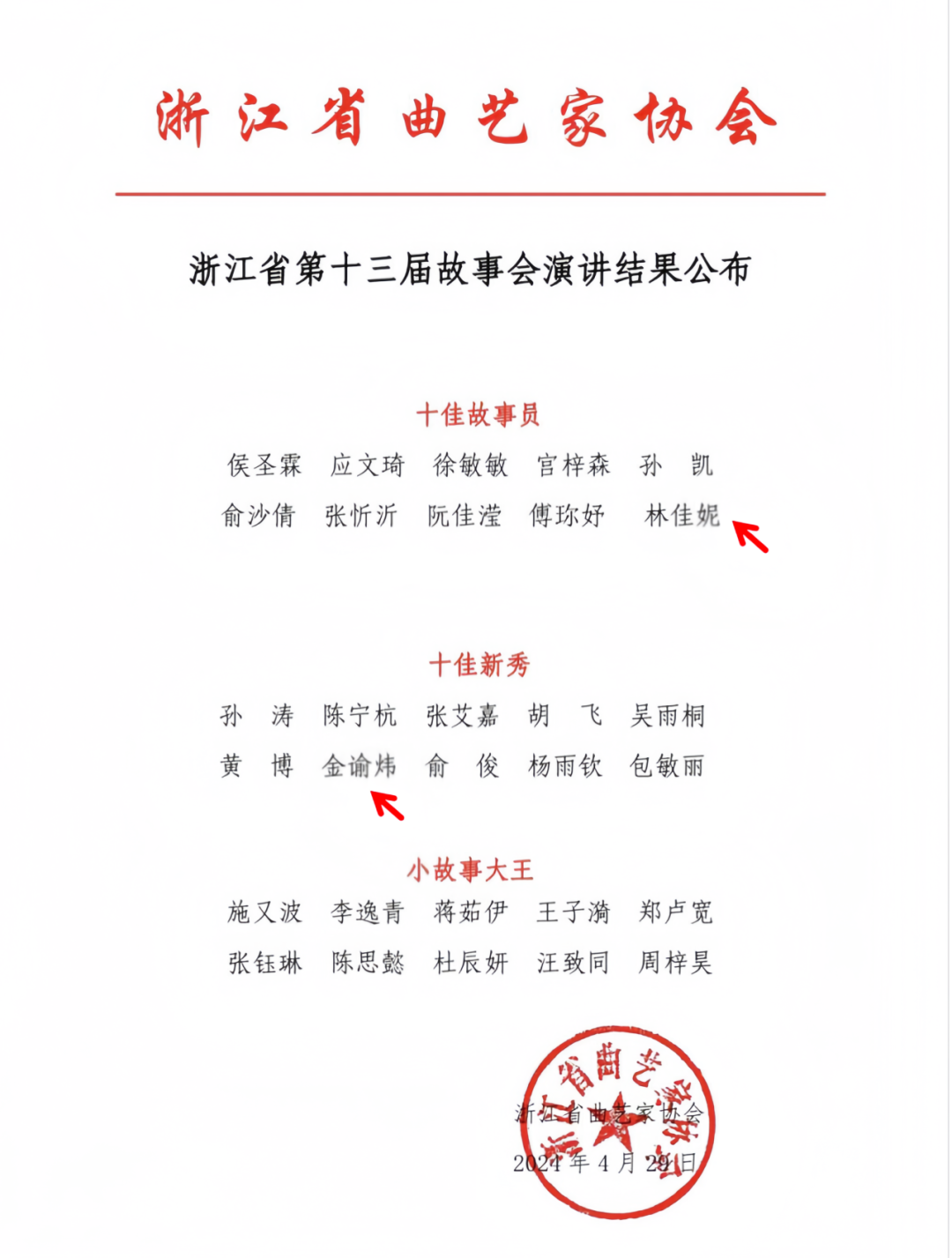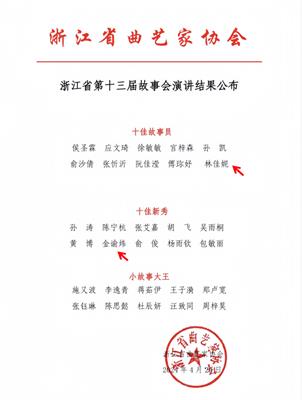 4月24日—26日,由浙江省曲艺家协会主办的浙江省第十三届故事会在宁波象山举行,浙艺演教学院表演艺术专业10位学生在专业教师齐帅的带领下前往参赛。经过角逐,表演艺术专业林佳妮和金谕炜同学分别获得浙江省"十佳故事员"和"十佳新秀"荣誉称号。