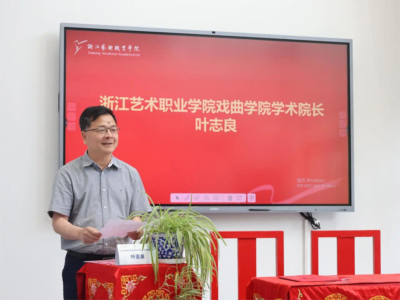 叶志良作表态发言。他表示,非常感谢浙江艺术职业学院的信任和邀请,浙艺是根植传统文化,放飞艺术梦想的摇篮,与浙艺戏曲更是机缘深厚,能够加入戏曲学院队伍倍感荣幸,定将不负重托,以高度的责任感和使命感,深耕戏曲学术研究、人才培养、艺术创作,为浙艺戏曲的高质量发展贡献己力。