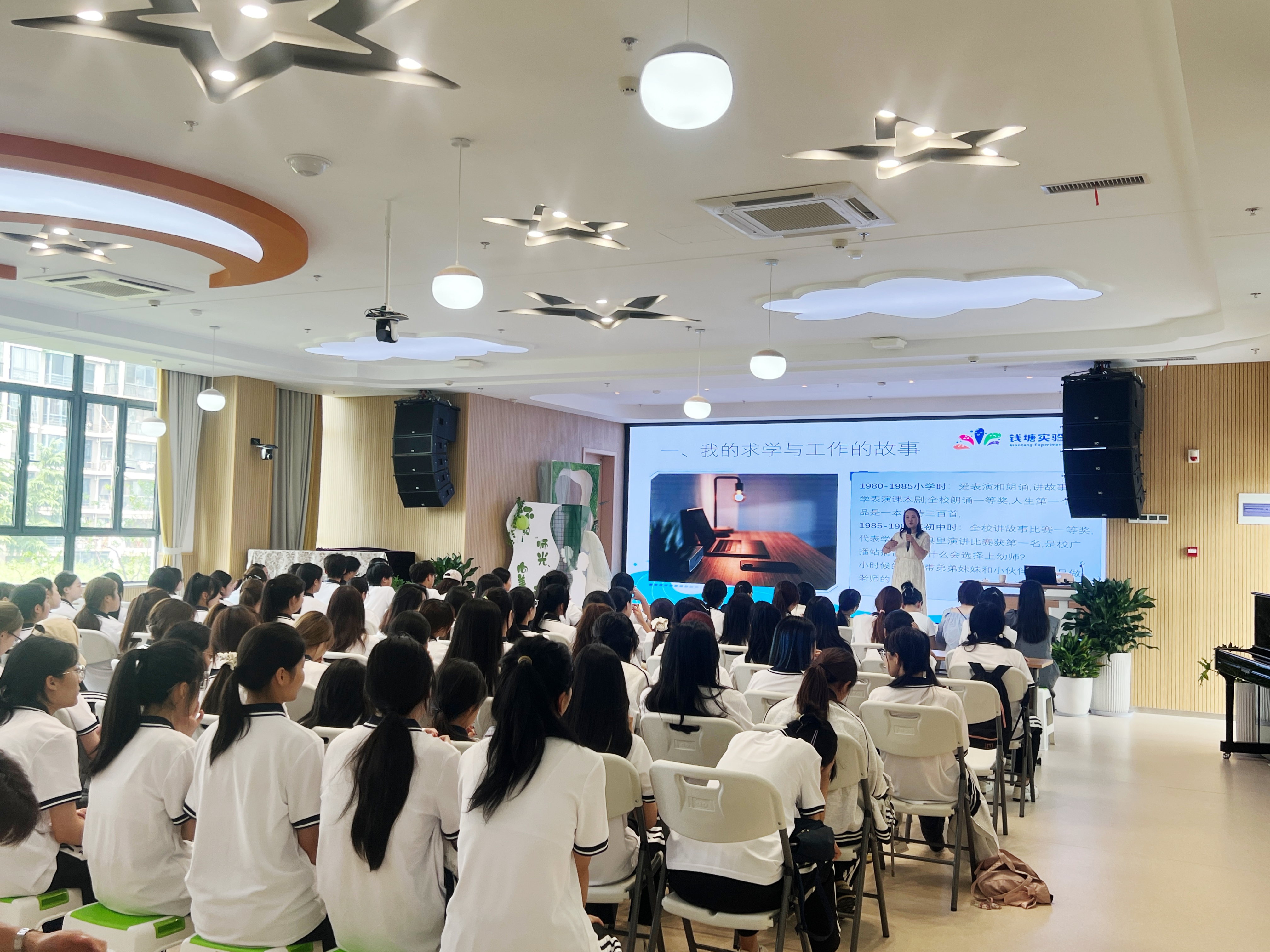 钱塘实验幼儿园园长陈英及3教师代表与新生们进行了亲切交流。她们结合自身在专业选择、大学学习阶段的亲身经历,娓娓道来,拉近了与同学们的距离3位老师轮流分享入职后与孩子们相处的温暖教育故事,生动展现了幼儿教师工作的专业性与幸福感,让新生们对未来的职业角色有了更具体、更感性的认知