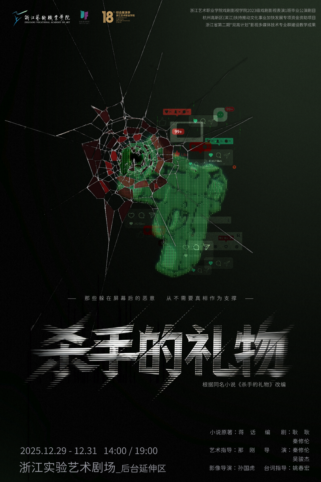 作为杭州高新区(滨江)扶持推动文化事业加快发展专项资金资助项目,以及浙江省第二期“双高计划”专业群建设教育重点成果之一,话剧《杀手的礼物》不仅是我校首次探索网络小说IP改编话剧的首秀,更是一场跨专业、跨学院融合创排的舞台艺术与影像技术结合的崭新尝试。