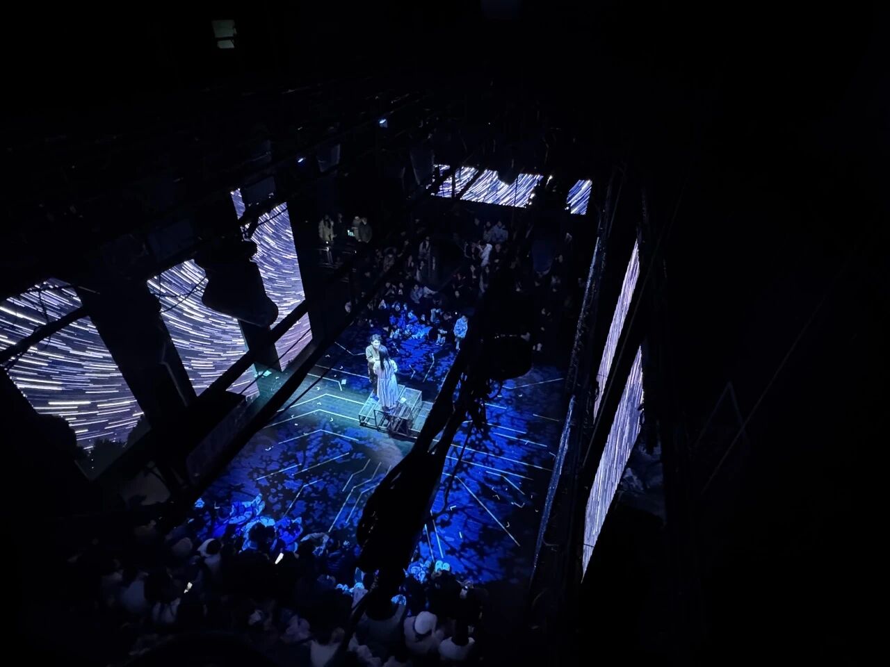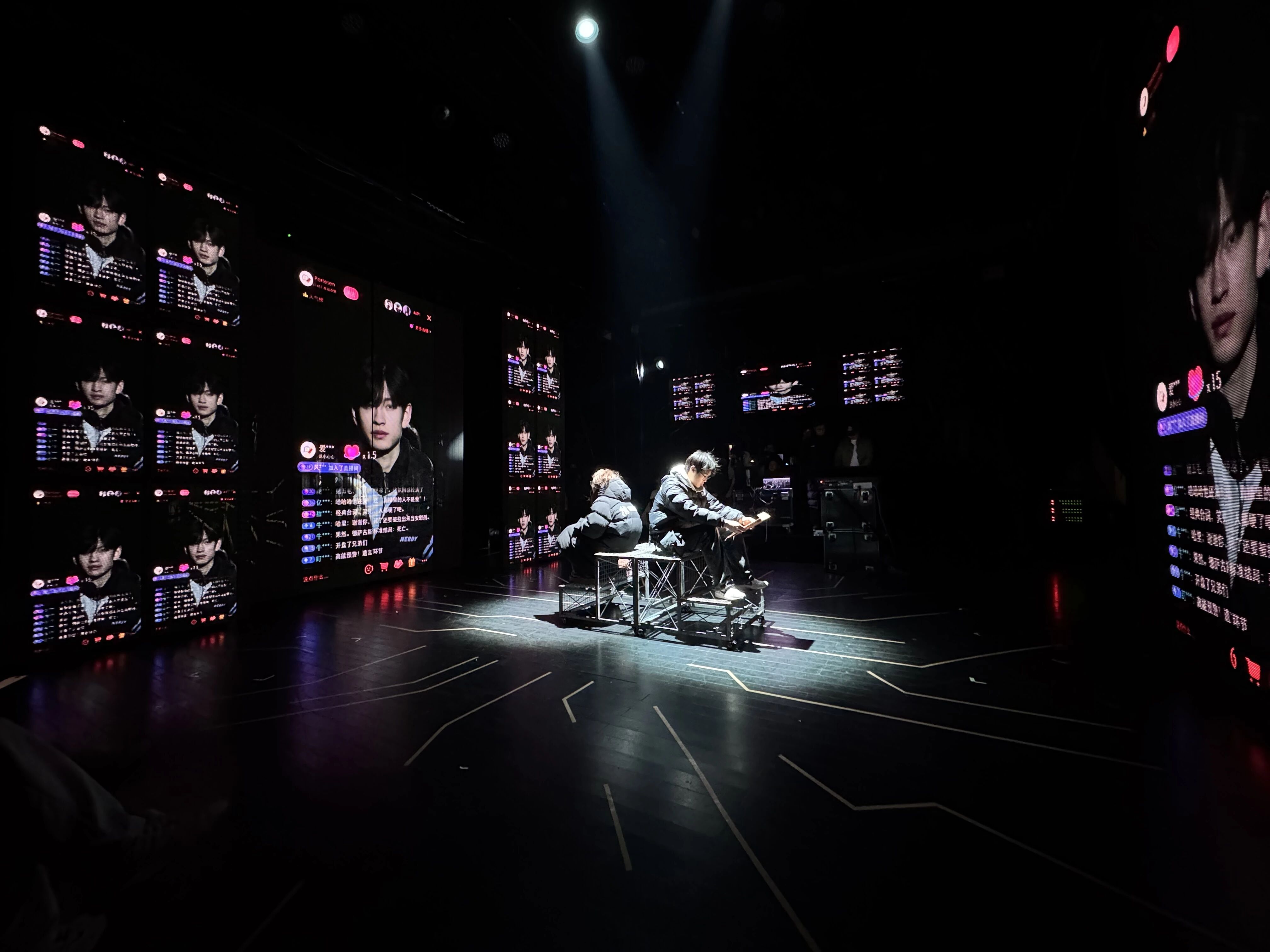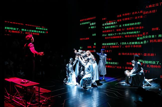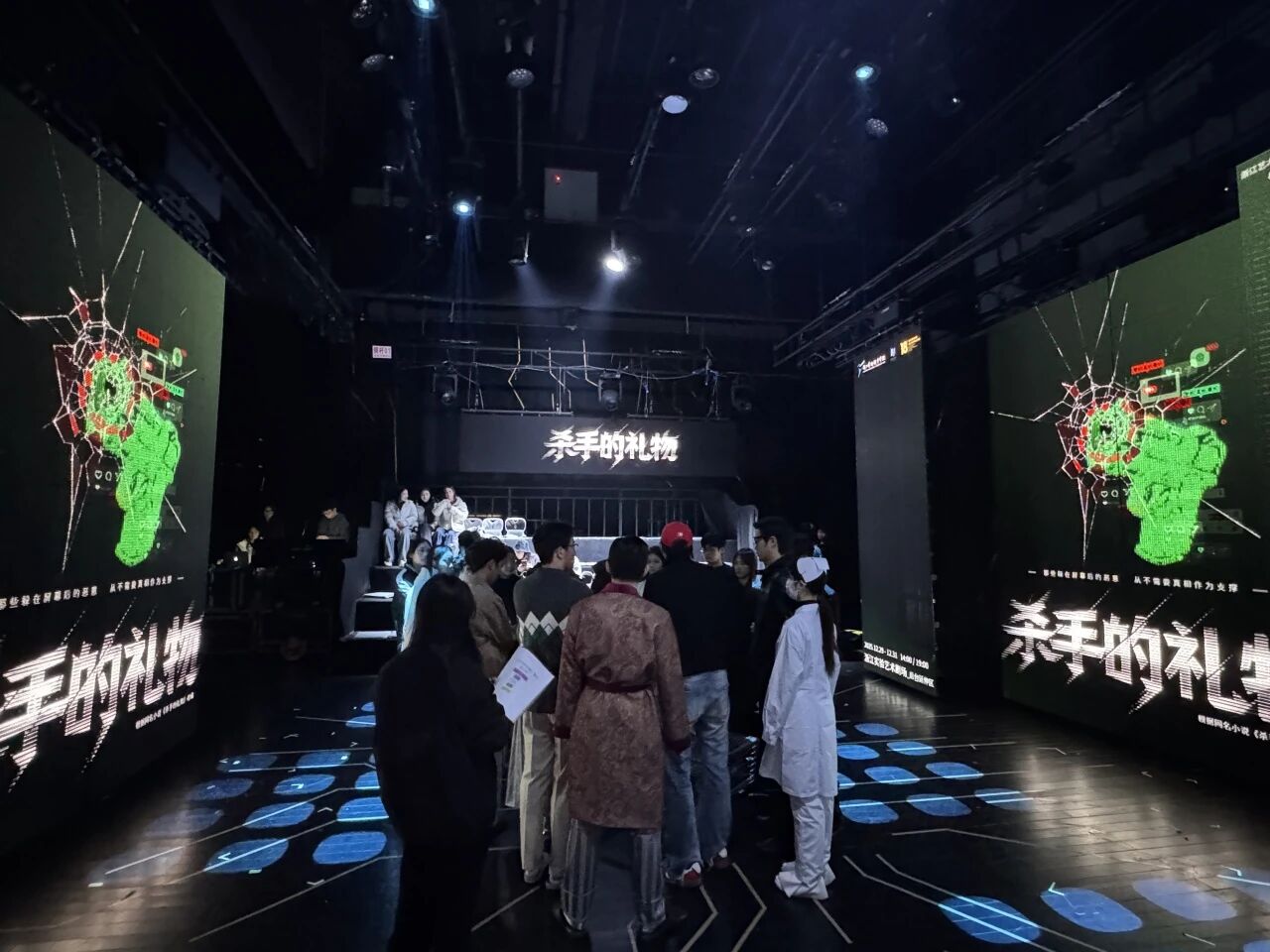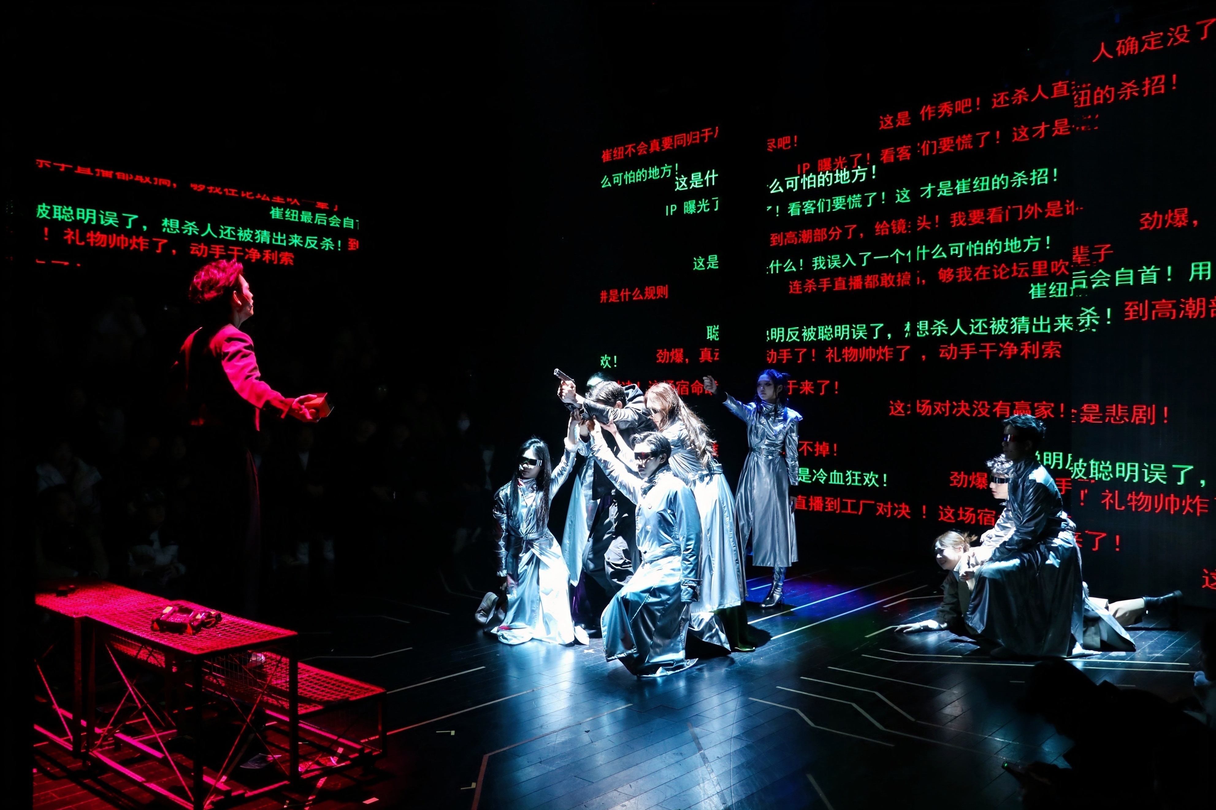 在大视听产业背景下,这场将戏剧表演与影像技术、多媒体交互深度绑定的创作,从创排的起始就注定要直面诸多前所未有的挑战,在初排阶段,导演秦修伦面临着将网络小说《杀手的礼物》从文字形象转化为舞台形象的复杂挑战。他表示,改编的核心在于寻找舞台的必然性:“我们需要在保留原著内核的基础上,进行大胆的提纯与重构。为了追求沉浸感,我们首次尝试了‘工’字形舞台与两侧观众席的布局,这直接改变了观演关系与叙事逻辑。”剧本为此历经十五稿打磨,旨在将原著相对独立的单元故事,编织成更具整体戏剧张力的舞台脉络,并融入对当下社会的观察。