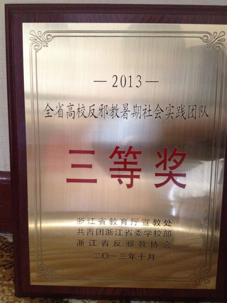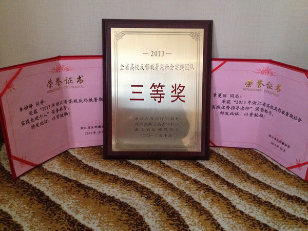 浙江艺术职业学院反邪教协会学生干部,文管系学生朱怡婷和熊小慧参加本次会议并代表接受表彰。其中,音乐系党总支副书记、院团委书记章蔓丽被省反邪教协会授予“2013年科普反邪暑期社会实践优秀指导老师”称号,朱怡婷同学获得了“2013年科普反邪暑期社会实践先进个人”称号。浙艺院“承中华传统 扬学子美德”暑期社会实践团获得省委宣传部等单位颁发的“2013年度全省高校反邪教暑期社会实践团队三等奖”。