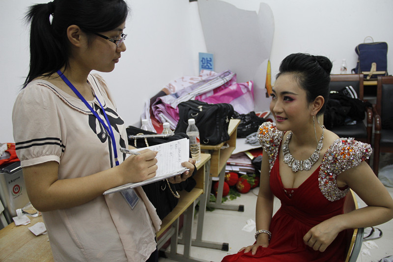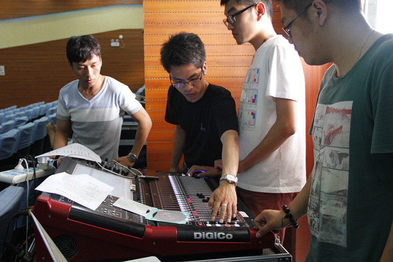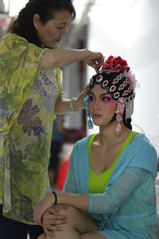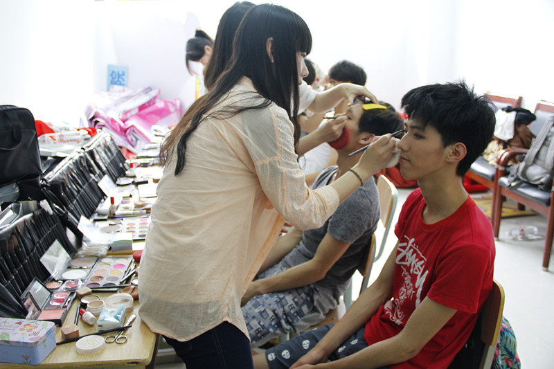 后台的无名英雄们一直默默工作着,负责音响的工作人员以三人为基础,分工合作,注意力高度集中,时时刻刻准备着,为观众传递出最美的声音。在演出过程中经常出现突发状况,他们经验丰富,及时抢救。多天的连续作战,已有一位化妆老师病倒,另一位化妆老师带着五位学生,依旧在后台忙碌着,耐心地为演员们编发饰,梳头发。演出前后,拆台和装台的工作人员,不辞辛劳、默默奉献。