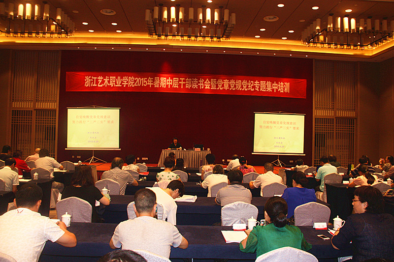 为深入学习贯彻习近平总书记系列重要讲话精神,结合”三严三实”专题教育,教育引导党员干部自觉学习党章党规党纪,全面提高广大党员干部守纪律、讲规矩的自觉性,进一步深化对高职教育发展的认识,谋划学院发展新思路,从而推进学院各项事业创新发展,8月28日至30日,浙江艺术职业学院在嘉兴举办2015年暑期中层干部读书会暨党章党规党纪专题培训班。院党委班子成员、处科级干部等70余人参加会议。