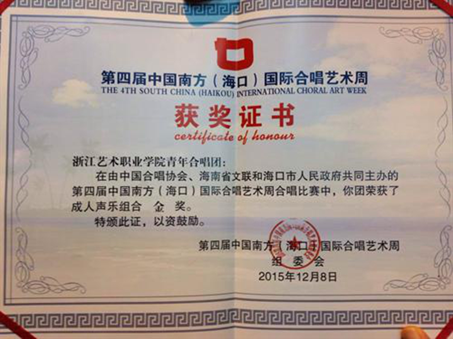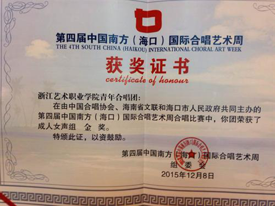 中国合唱协会、海南省文联和海口市政府共同主办,海南省合唱协会和海口市文体局共同承办的第四届中国南方(海口)国际合唱艺术周于12月5日-9日在海口市人民大会堂举行。浙江艺术职业学院青年合唱团作为浙江省唯一一支参赛团队,喜获成人混声组、成人女生组、成人声乐组合(男声)组三个组别的金奖,合唱团指挥费小龙荣获优秀指挥奖。