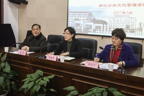 朱海闵代表学院向学员表示了热烈欢迎。她表示,浙渝联手“三区”文化人才培训是浙渝文化交流共享的喜事,浙艺作为全国文化干部培训浙江基地,在文化干部的培养上已经积累一定的教学经验,特别是学院增挂了浙江公共文化管理学院的办学牌子后,在公共文化培训上的成绩越发丰厚。本次受重庆方面委托承担这个培训班,浙艺将在浙艺师资的基础上,邀请相关专家、学者参与授课,在文化建设政策法规解读、地方文化建设的策略与思路、文化产业发展、非遗保护、干部素养等方面开展培训,积极做好培训工作,让来自重庆的学员们不虚此行。朱海闵还向学员介绍了浙艺近年的背景与发展。