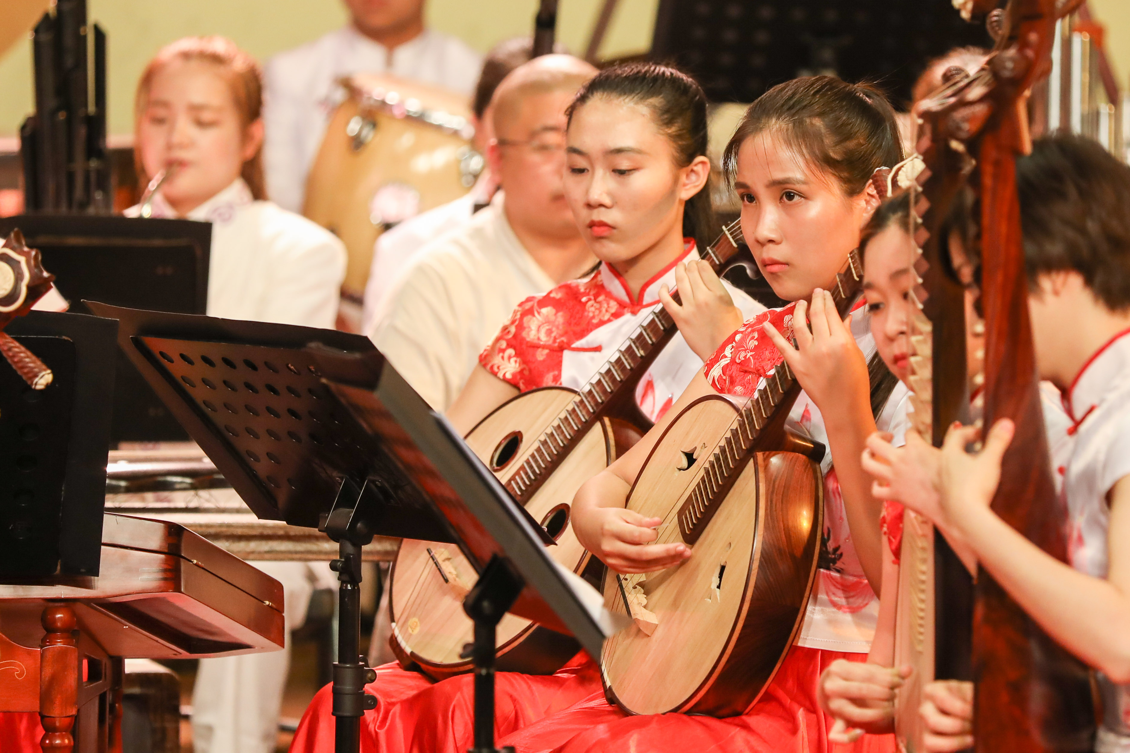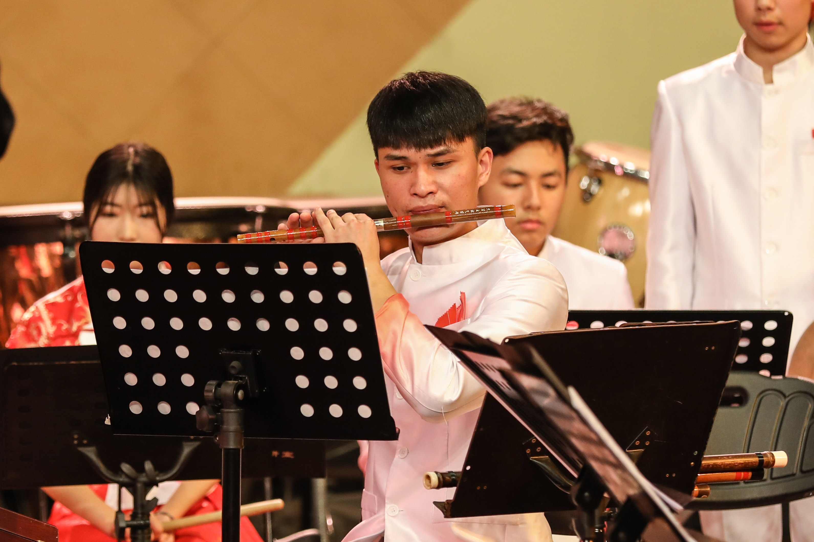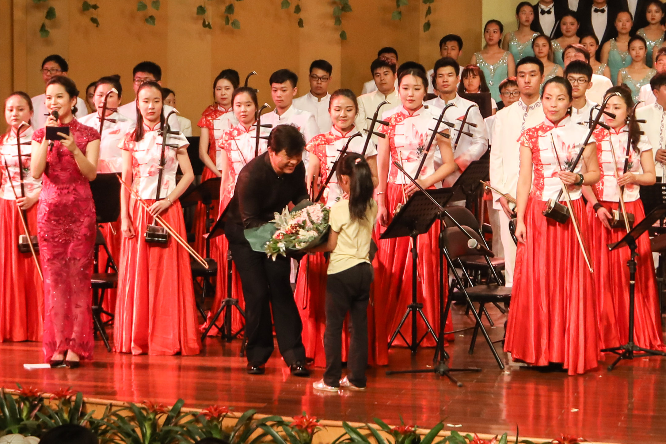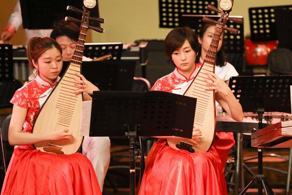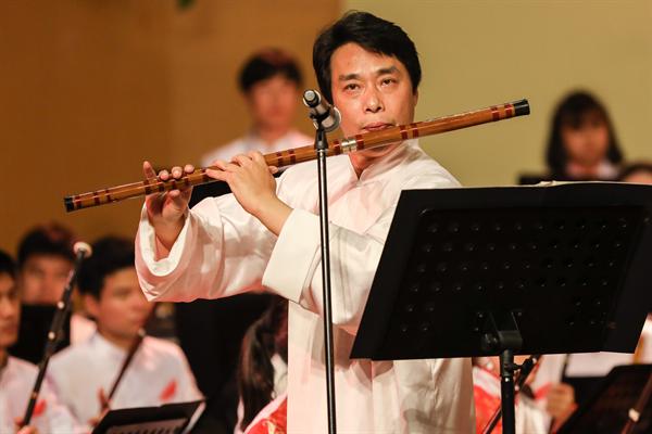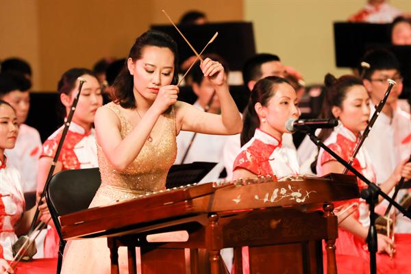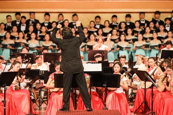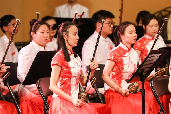 音乐会由浙江艺术职业学院民族管弦乐团演奏,这是一支具有较高演奏水准、建制规范的学生民族管弦乐团,由优秀专业教师担任乐团首席及声部指导。晚会特邀中国广播民族乐团国家一级指挥张列担纲本场音乐会指挥。伴随着民族管弦乐《治水令》的气势恢宏,音乐会拉开了帷幕。这首由委约作曲家、上海歌剧院国家一级作曲朱晓谷创作的大型民族交响乐作品,曾在浙江艺术职业学院六十周年校庆、第十一届“长三角”民族乐团展演等重大演出活动中有过精彩亮相,此番再度献演,依然震慑人心。该作品以“灾”、“难”、“治”、“凯”四部分组成,围绕“大禹治水”主线一气呵成,表达了五水可治、家园可兴的精神。大气磅礴的《治水令》之后,是清流涌动的扬琴协奏曲《咏竹》。该曲由委约作曲家、西安音乐学院硕士生导师、我院特聘专家周煜国创作,我院优秀毕业生袁文君担任扬琴演奏。作品歌咏了江南的竹子,颂扬了有如竹子般挺拔秀丽、岁月不寒的中华民族风骨气节,尾声处那一段和着悠悠古琴的人声诵读,更是传达了竹影疏淡、高洁坚贞的独特意境。民族室内乐《八婺来风》是整场音乐会中最富有地方特色的作品,这首由委约作曲家、浙江交响乐团国家一级作曲王天明作曲的民族器乐合奏曲,大量引用了浙江金华的地方戏曲婺剧音乐曲调素材,锣鼓参天、响板阵阵,以宏伟的视角叙述了浙江八婺大地的博大人文情怀。弹拨乐合奏《茶乡情》,宛如一股涓涓溪流,令刚刚还沉浸在热烈欢腾气氛中的心情得以舒缓放松。该曲由委约作曲家、中国民族管弦乐协会副会长、国家一级作曲顾冠仁所作,以琵琶、阮这两种音色温润的乐器作为主奏乐器,寓意着茶香的甘甜芬芳。大量铺陈的铃鼓和跳跃的节奏型让作品富有了喜庆意味,表达了生长在江南茶乡的人们对幸福生活的热爱。音乐会的第二部协奏曲是由上海音乐学院作曲系教授徐坚强创作的竹笛与乐队《竹韵》,由我院科研处处长、吴樟华教授担任笛子演奏。悠然大曲笛,浑厚古朴、浓郁凝重,恰似有诉不尽的甘苦、道不尽的沧桑,于深沉中现昂扬,用写意的音乐语言,表达了作者对竹林的各种诗情画意。音乐会压轴曲目二胡、乐队与合唱《鉴湖侠女——秋瑾》是我国著名作曲家何占豪的作品,由音乐系副主任高澄明教授担任二胡演奏,是整场音乐会参演人数最多的一部大型乐队作品。用音乐讲述秋瑾的故事,时而激昂穿越、时而如泣如诉的胡声与男女混声合唱、锵锵锣鼓声的多层次音响纵横交织,用大乐队、大手笔的方式将一代巾帼英雄秋瑾的侠骨柔情刻画得淋漓尽致,描摹出鉴湖侠女的伟大民族英雄形象。