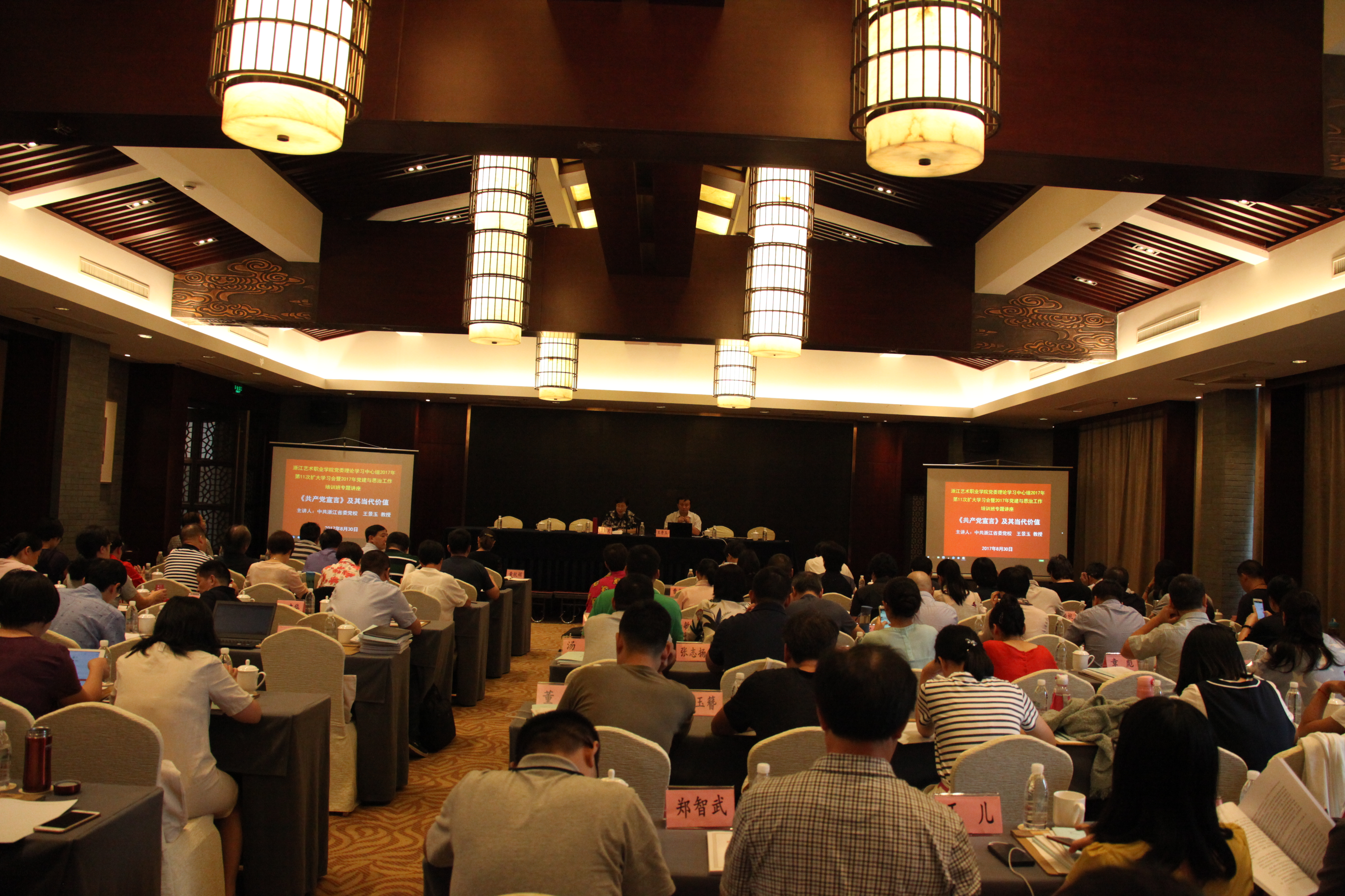 8月30日,浙江艺术职业学院党委理论学习中心组2017年第11次扩大学习会暨党建与思政教育工作培训班特邀浙江省委党校政治学教研部王景玉教授作《<共产党宣言>及其当代价值》专题讲座。党委书记朱海闵主持,院党委班子成员、处科级干部、思政理论课教师、党建与思政教育工作者等120余人聆听讲座。