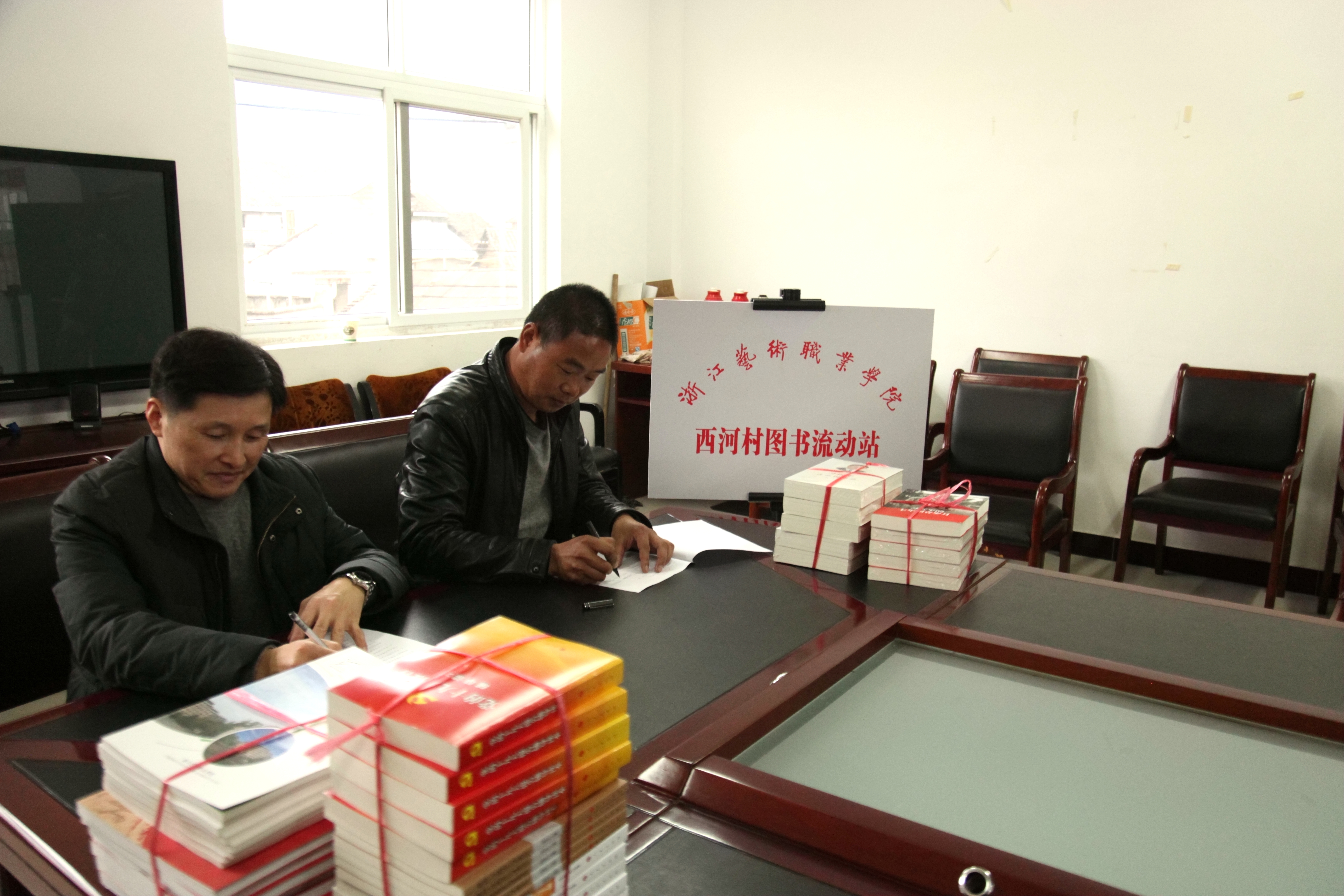座谈会后,浙艺党委宣传部向西河村赠送《党的十九大报告辅导读本》《十九大党章修正案学习问答》《习近平谈治国理政》第二卷、《习近平的七年知青岁月》《重读<实践论><矛盾论>》以及浙艺画册、校友特刊等书籍资料。浙艺图书信息中心与西河村签订建立浙江艺术职业学院西河村图书流动站协议,进行授牌,交接图书。此次浙艺图书信息中心为西河村提供了365册各类精美书籍,种类多样,都是村民们喜爱看的书,今后将每年进行图书轮换,使当地村民可以阅读到最新的图书。