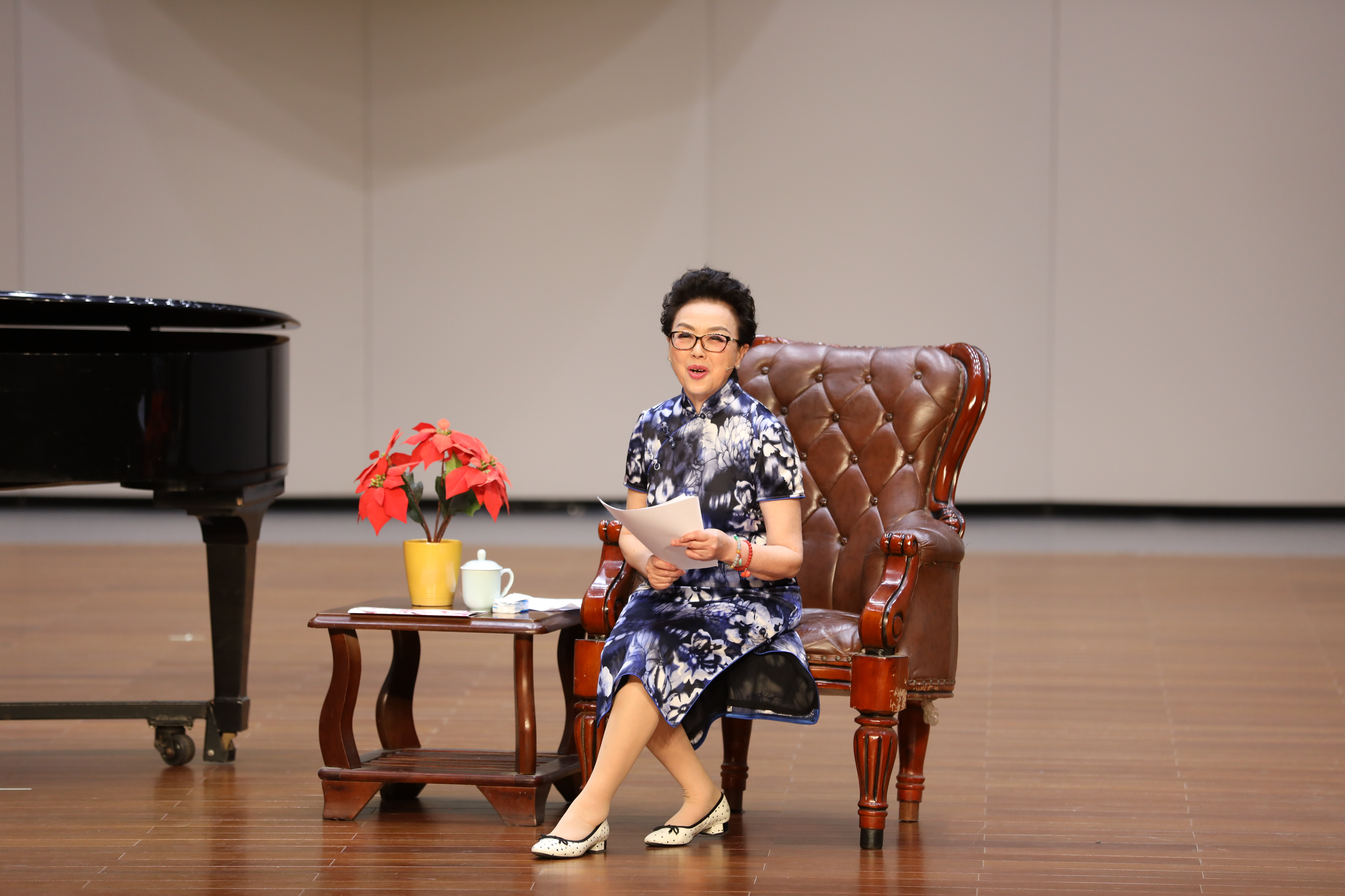 当晚浙江音乐厅大堂变成了花的海洋,花篮摆成了一条“花毯”,满眼望去都是祝胡素银音乐大讲堂暨师生音乐会圆满成功。胡素银为国家一级演员,第八届、九届浙江省政协委员,中国音乐家协会会员,浙江省音乐家协会声乐专业委员会顾问。曾是民盟浙江省委会委员,2005年11月荣获文化部“第七届区永熙优秀音乐教育奖”。对民族音乐文化和音乐表演艺术的执着,是70多岁的胡素银一直坚守与传承的。音乐会伊始,她提到中共中央办公厅、国务院办公厅印发的《关于实施中华优秀传统文化传承发展工程的意见》,就像一面旗帜,让她有底气在大讲堂上和大家交流中华民族优秀传统文化传承。传承发展工程最重要的是“人”,是教育,立德树人是根本任务。这就是讲座名称的由来。胡素银从1987年调入浙江艺术学校(现为浙江艺术职业学院)越剧科担任声乐老师讲起,讲述了一路走来,面对不同学生不同嗓音条件的开发,音乐教育理念在一代代学生身上的呈现,向观众传递民歌知识,讲述民歌故事。她说,自己一直以来坚信,做难事必有所得。民歌,需要有人记住,有人欣赏,有人传承。在这个时代,机会来了。