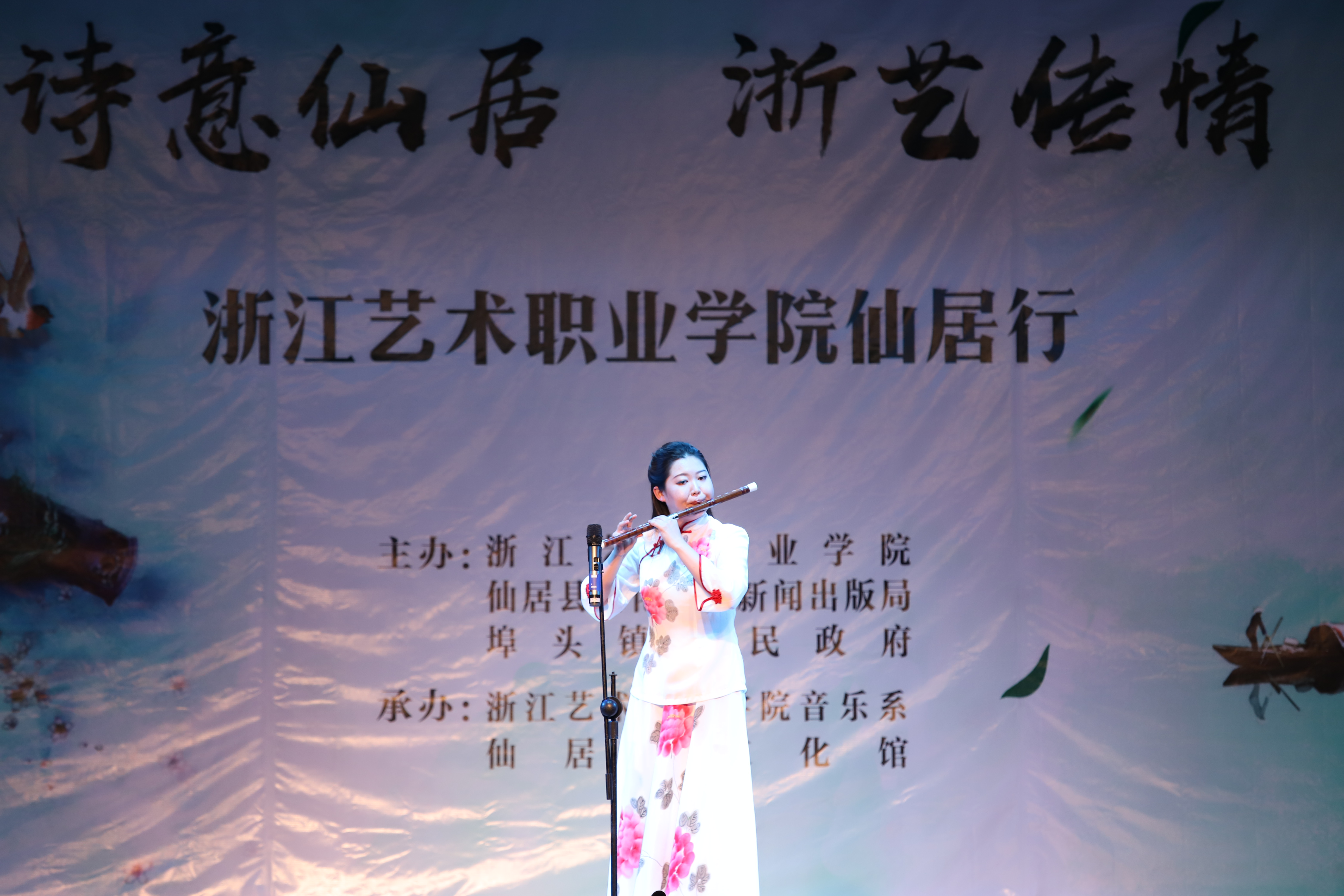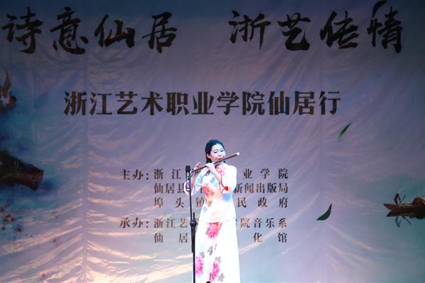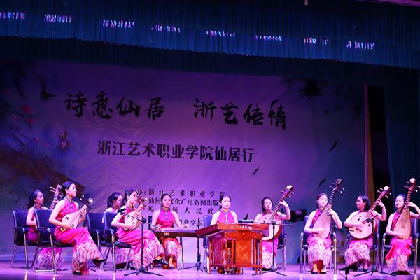 授牌仪式后,浙艺师生为当地群众作了精彩演出。由古筝、扬琴、中软、琵琶等民族传统乐器组成的弹拨乐重奏《鲁腔》拉开了晚会的序幕,笛子独奏《牧民新歌》富含田园气息,阿卡贝拉《小九妹》表演形式令村民们耳目一新,群舞《八女投江》演绎了革命烈士的英勇无畏,萨克斯独奏《此情不移》旋律悠扬,女声独唱《芦花》声声动人,《流行舞串烧》和群舞《不想说再见》青春洋溢,古筝独奏《西部主题畅想曲》仿佛将观众带回了古时的西域,演出在女声独唱《中国进入新时代》中落下了帷幕。整台节目丰富多彩,村民们赞叹不已,更有村民说:“浙艺真是全省文艺人才的‘黄埔军校’啊”!当晚演出进行了现场直播,点击量达12.3万人次。次日晚,浙艺师生在仙居县淡竹乡下叶村再次进行专场演出。