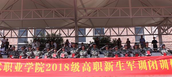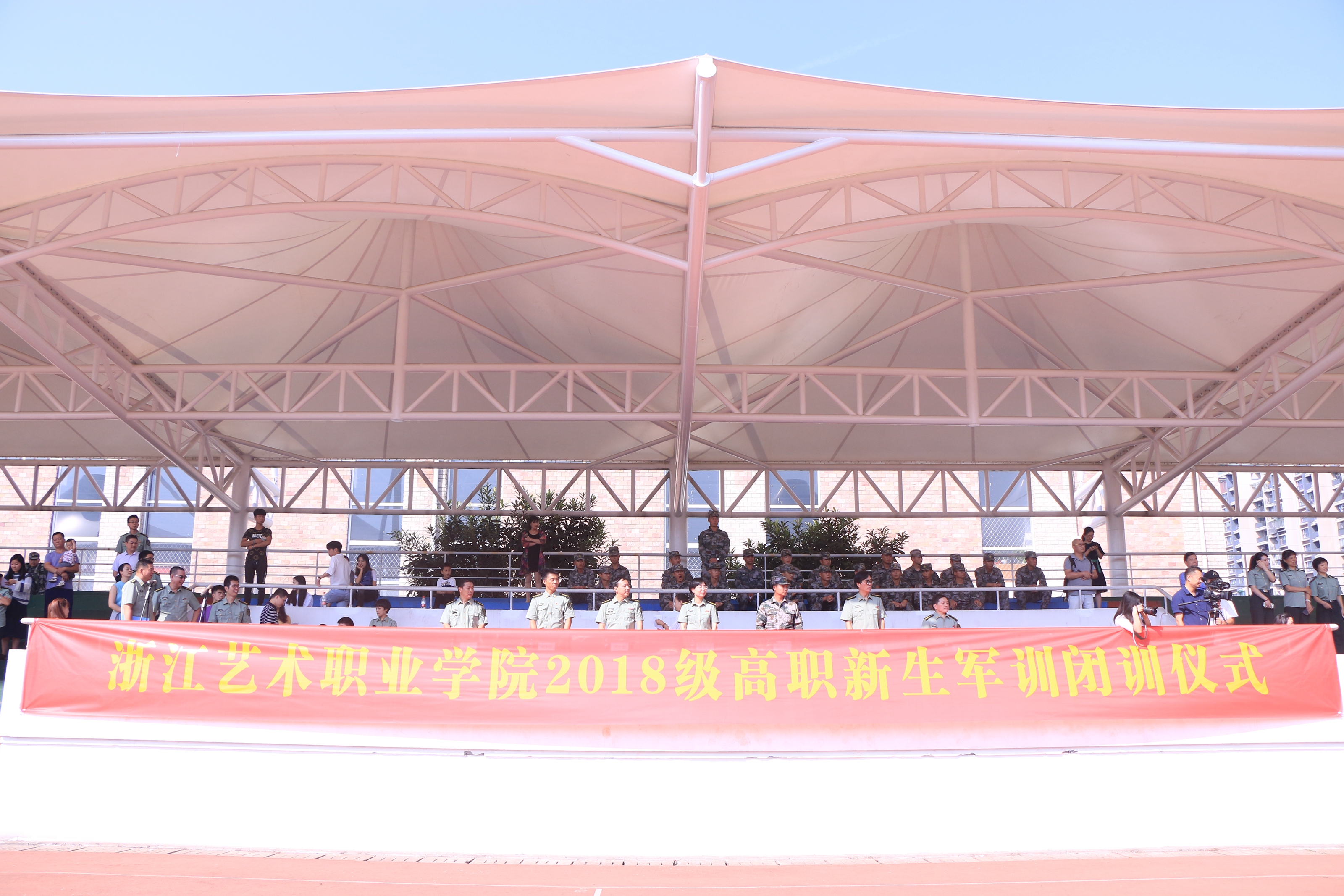 校党委书记朱海闵向承担本次军训任务的陆军某集团军勤务支援某旅陈贝贝副营长赠送锦旗。夏开堂宣布军训先进集体和个人名单。副院长沈恒致闭幕词,向圆满完成此次军训任务,在军训中取得优异成绩的同学们表示衷心的祝贺,希望全体同学自觉将个人的求学梦、成才梦、人生梦融入中华民族伟大复兴的中国梦之中,把军训中学到的好思想、好传统、好作风带到今后的学习、生活中,秉承“求真尚美、精艺修为”校训,做一名德智体美劳全面发展的浙艺人。副院长沈军甫代表学院宣读感谢信,向承训部队官兵表示衷心感谢。