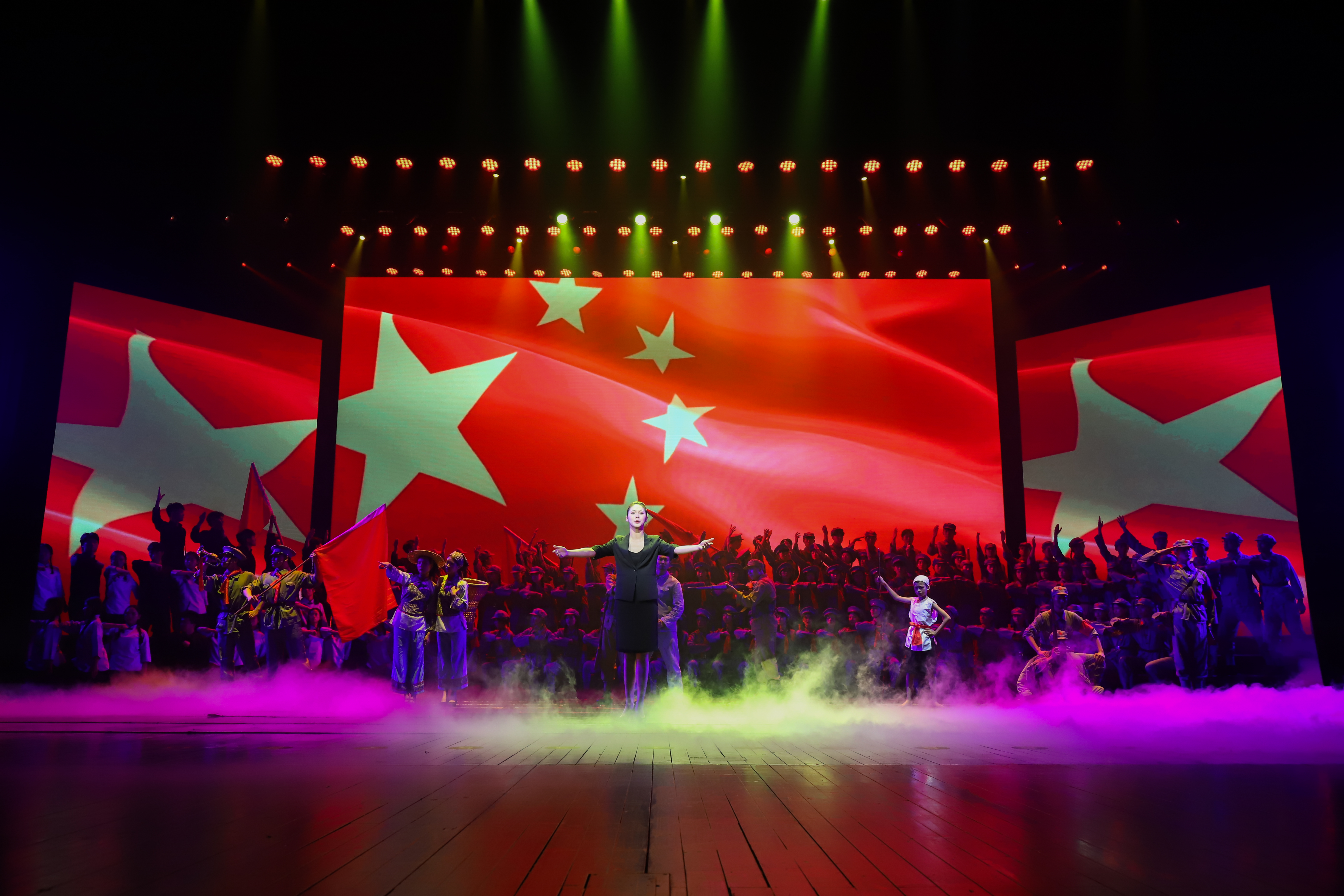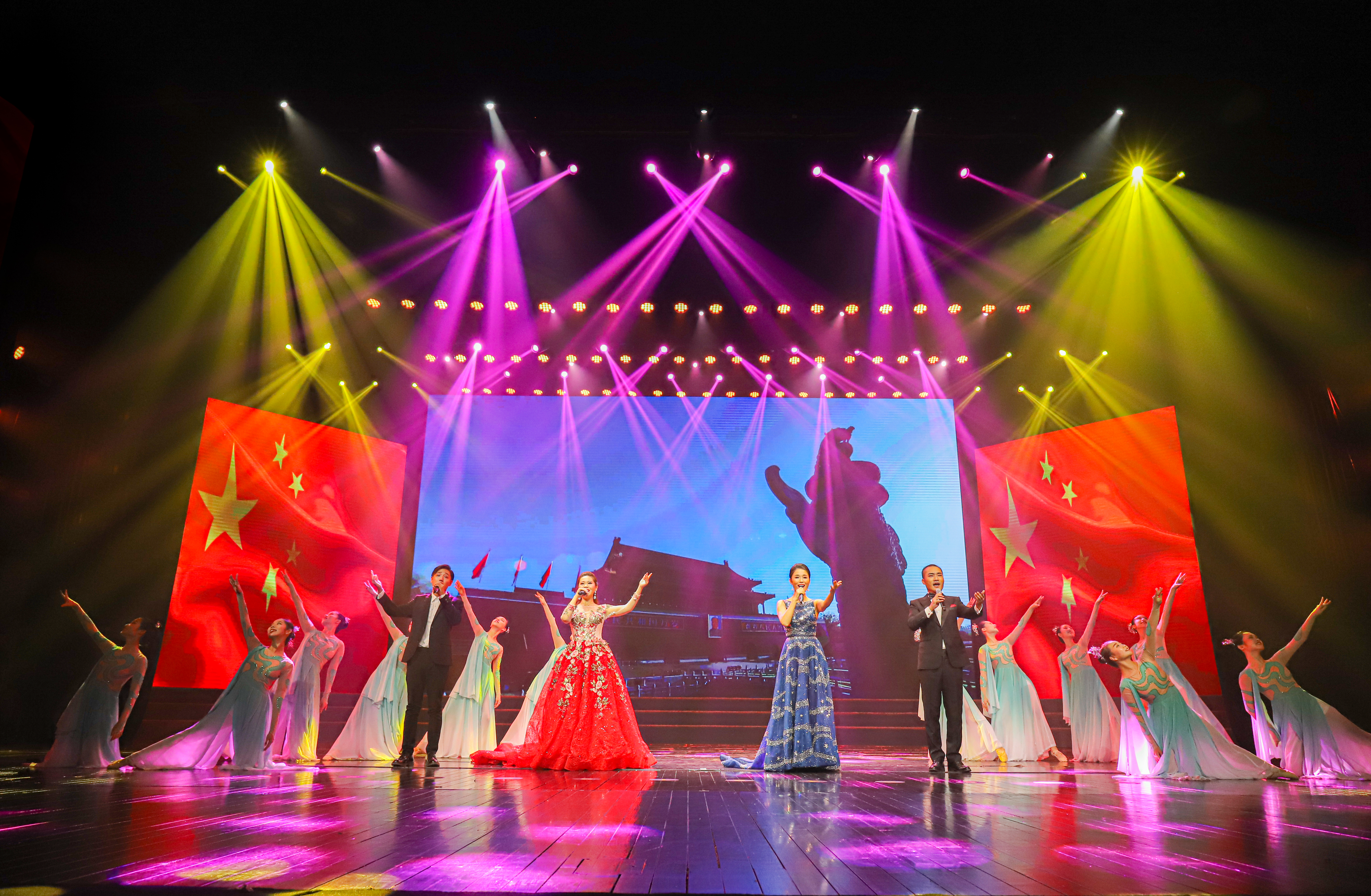 台上演员和观众全体合唱了《歌唱祖国》,国旗挥起来,歌声响彻剧场内外,共同祝祖国生日快乐,祝福祖国越来越好。