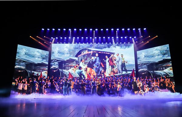 2019级新生、小百花班学生陈可心挥舞着国旗首先出场,“我和我的祖国,一刻也不能分割”的旋律点燃了现场合唱的气氛。舞蹈系群舞《烽火摇篮》演绎了抗战时期,革命战士在炮火中奋勇抗战,为了革命信念、人民幸福壮烈牺牲的场景,催人泪下。戏剧系副主任周伟君演唱了越剧专业教师吕静策划的课程思政作品、越歌《七律·长征》,气势恢宏振奋人心,台下掌声雷动。音乐系女声小组唱《洪湖岸边是我家》,清新秀丽,柔美中又带着俏皮。戏剧系青年教师郑佳艳演唱京歌《卜算子·咏梅》,一亮嗓,台下就响起一片尖叫。观众纷纷拿起手机全程录像。原创音诗画《初心》中,戏剧影视表演专业五个班级130多人集体亮相,凝心聚力,再现了党的诞生、南昌起义、红军长征等历史瞬间。