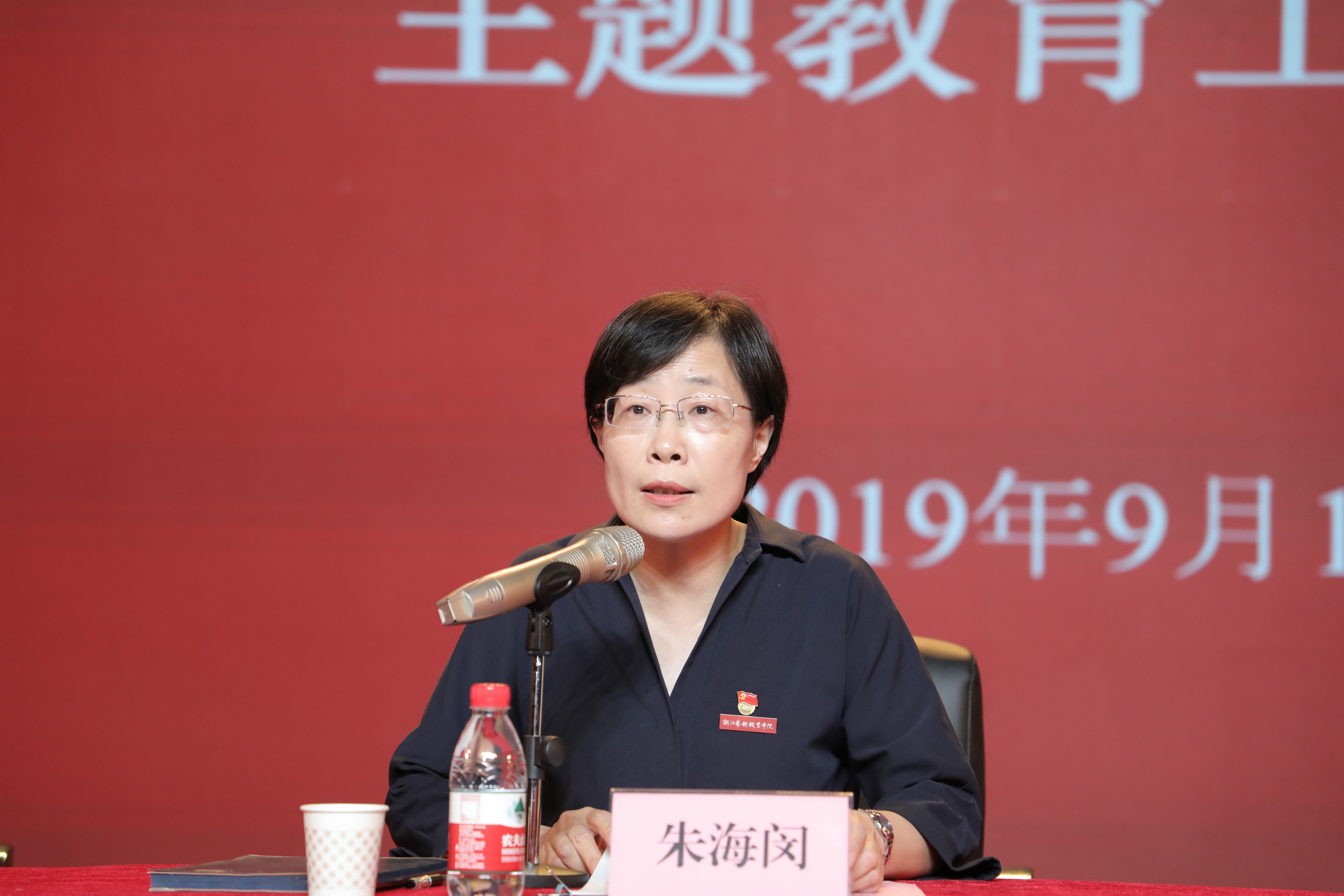 朱海闵强调,开展主题教育,要做到四个“贯穿始终”。一要把学习教育贯穿始终,原原本本自学,集中研讨深学,创新形式活学。二要把调查研究贯穿始终,紧紧围绕贯彻落实上级决策部署,围绕解决师生反映强烈的热点难点问题,围绕解决学校改革发展存在的突出问题,围绕解决学校党的建设和思想政治工作中的短板和问题,立足办学职能和我们正在做的事情,结合推进“最多跑一次”改革、深化“三服务”、增强“脚力眼力脑力笔力”教育实践、“建设清廉浙艺、创建模范单位”等重要工作,结合高质量完成“十三五”规划启动“十四五”规划编制调研、推进实施省级优质校建设方案、扎实推动“双高”计划等重点任务,有针对性地开展调查研究,察实情、出实招、求实效。三要把检视问题贯穿始终,要在对标对照、听取意见、认真反思、批评教育中检视,自觉对照习近平新时代中国特色社会主义思想、习近平总书记重要指示批示精神和党中央决策部署,对照习近平总书记指出的突出问题,对照党章党规,对照初心使命,对照师生和大众对优质艺术教育的新期待,对照先进典型与身边榜样,找差距、摆不足、查短板,深刻检视剖析。四要把整改落实贯穿始终,对标中央精神抓整改,深化专项整治抓整改,借势借力抓整改,抓住主题教育契机推进“清廉浙艺”“五项行动”的落实,针对性对优质校建设和“双高”计划等内涵建设任务推进中的发展堵点、治理难点问题集中攻坚,着力整改解决党委领导下的校长负责制、基层党组织建设、教师队伍建设、意识形态工作、学生社团工作中存在的突出问题,细化任务清单、工作措施,以钉钉子精神推进落实。