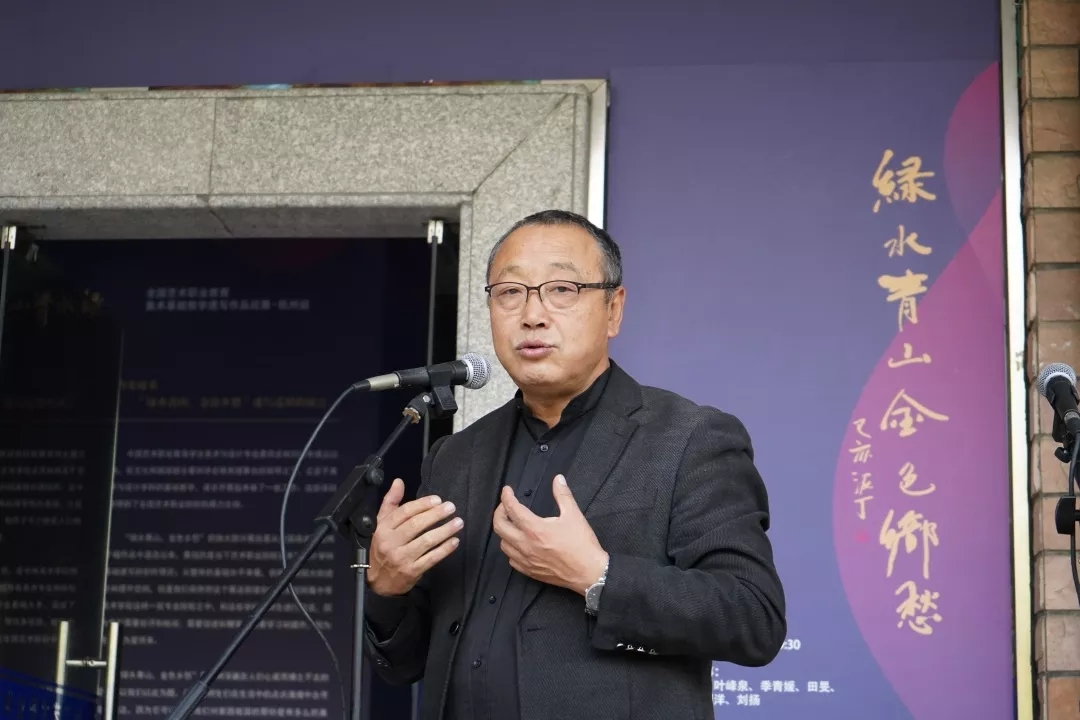 孙伟致辞。他向学会积极参与巡展的140多所院校表示感谢。这次展览以“绿水青山、金色乡愁”家国情怀为主题,意图把祖国70年建设伟大成就和我们对祖国的感情通过画笔来描绘、表达,作为向中华人民共和国成立70周年的献礼。本次巡展共有11站,杭州是继中央美术学院附中(北京站)首展之后巡展的第一站,得到了浙江艺术职业学院的大力支持,在此代表全国艺术职业院校向浙艺表示感谢!希望兄弟院校的领导、老师看展后多多提出宝贵意见,推动艺术职业教育领域美术和设计专业发展更进一步,特别是推动基础教学研究和水平更上一层楼。