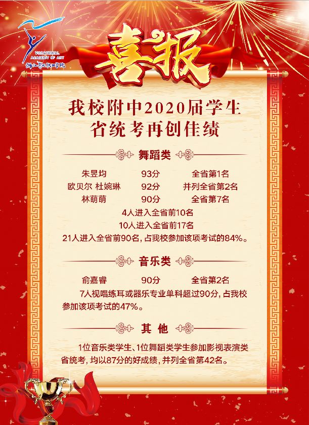 浙江省艺术类统考成绩近日揭晓,我校附中学子不负众望,凭借过硬的专业实力,再一次取得了喜人的成绩。