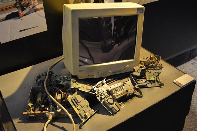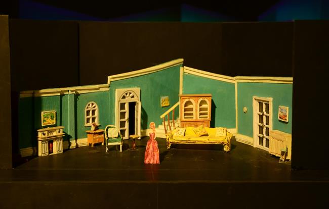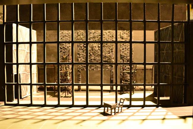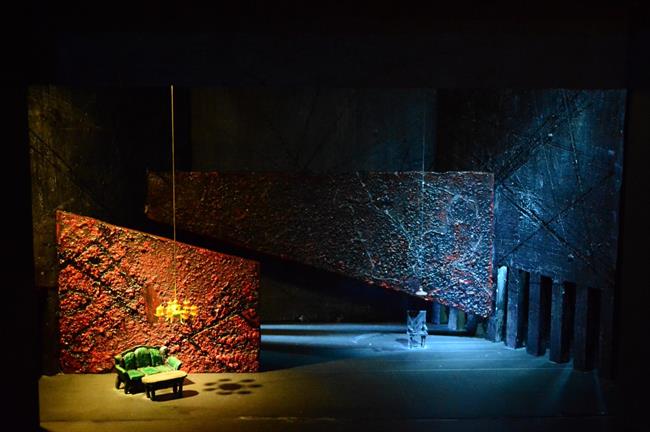 展厅一角,还有一个与《巴尔干妇女》实景不同的模型,充满了艺术性的大胆尝试,用了镜面的亚克力板,舞台压得很低,给人一种压迫感,细缝中的红光象征着战争的血腥,镜面上用了锡箔纸做出破碎山河的样子,其制作充满想象力,也从细节处展示出战争对人们的伤害。模型制作者许益畅说:“舞美设计是一个不断推翻的过程,但就是在这样的过程中才能学习,不断进步!”