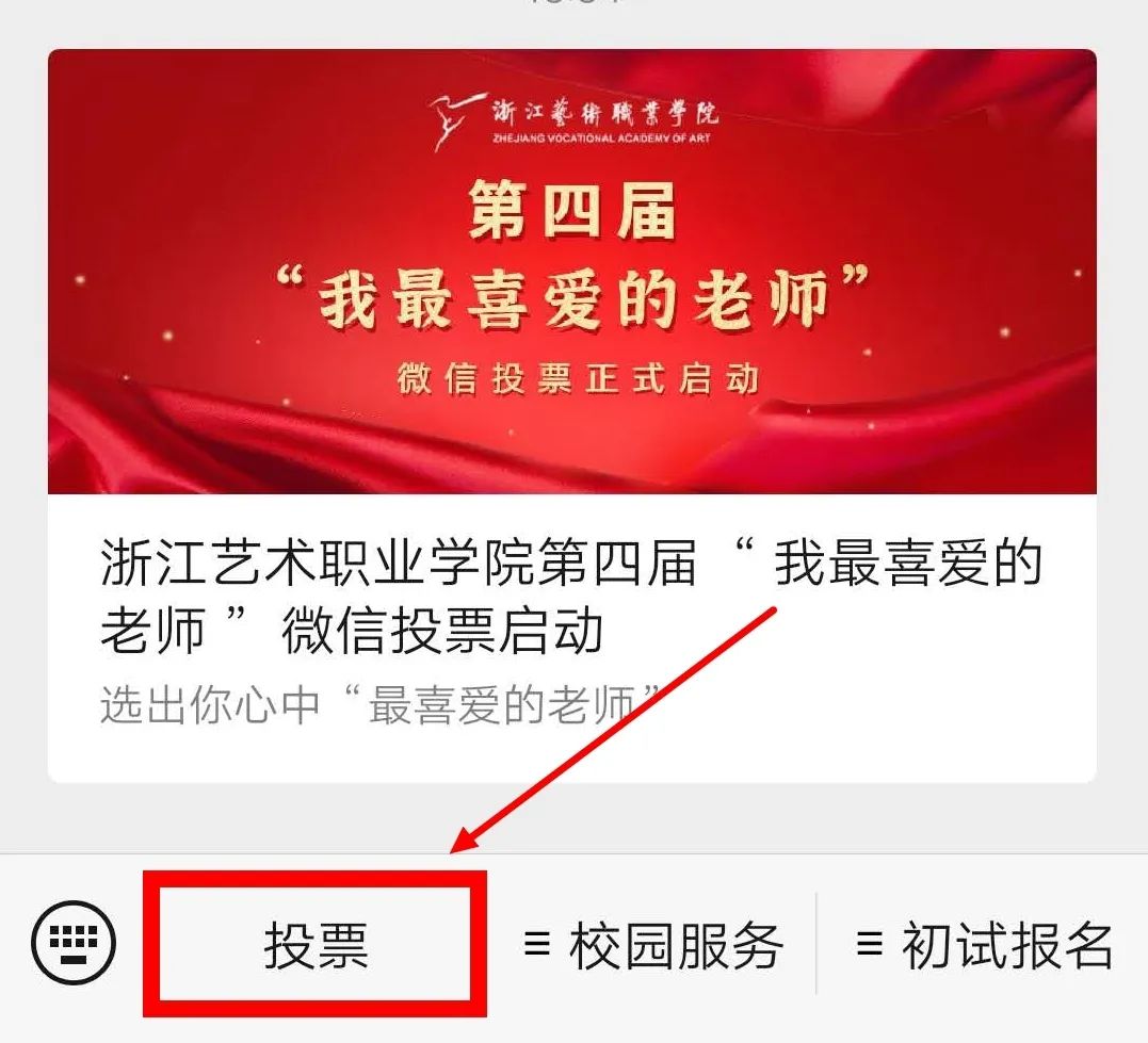 1、进入“浙江艺术职业学院”公众号,点击下方“投票”菜单。